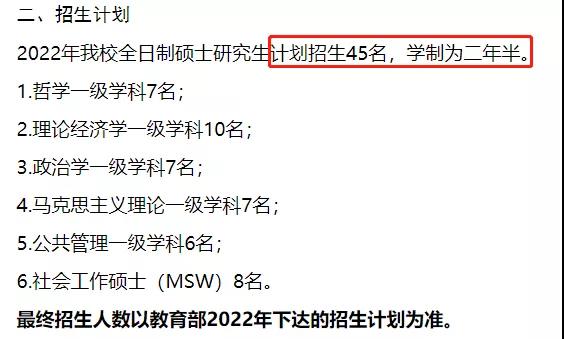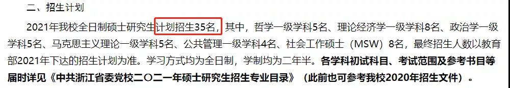 根據(jù)中共浙江省委黨校研究生教育網(wǎng)發(fā)布的《中共浙江省委黨校2022年全日制碩士研究生招生計(jì)劃》可知,2022年全日制碩士研究生共計(jì)劃招生45名,與去年招生35名相比,擴(kuò)招了10名,增幅約為28.6%,其中除社會(huì)工作碩士(MSW)依然招生8名外,其余專(zhuān)業(yè)分別擴(kuò)招了2名。