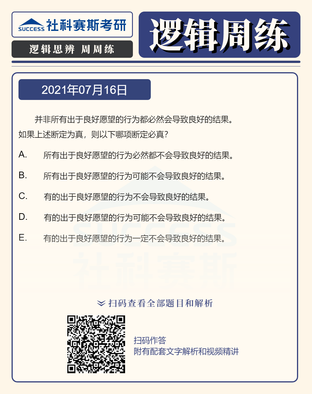 邏輯思辨周周練,考研邏輯專(zhuān)項(xiàng)練習(xí),攻克邏輯難關(guān)!今天社科賽斯考研網(wǎng)小編整理了“邏輯專(zhuān)項(xiàng)練習(xí):7月16日邏輯專(zhuān)項(xiàng)練習(xí)及答案”,希望能對(duì)廣大考生有所幫助!