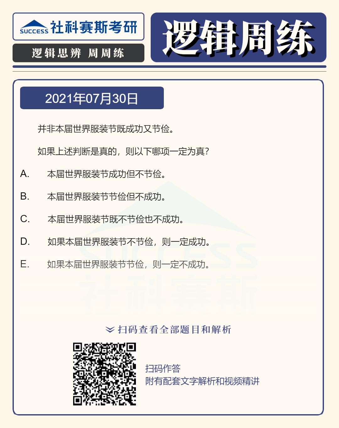 以上就是社科賽斯考研網(wǎng)小編為大家整理邏輯專項(xiàng)練習(xí):7月30日邏輯專項(xiàng)練習(xí)及答案的全部內(nèi)容,希望各位考生堅(jiān)持利用起來,想要獲取更多內(nèi)容請持續(xù)關(guān)注社科賽斯考研網(wǎng)。