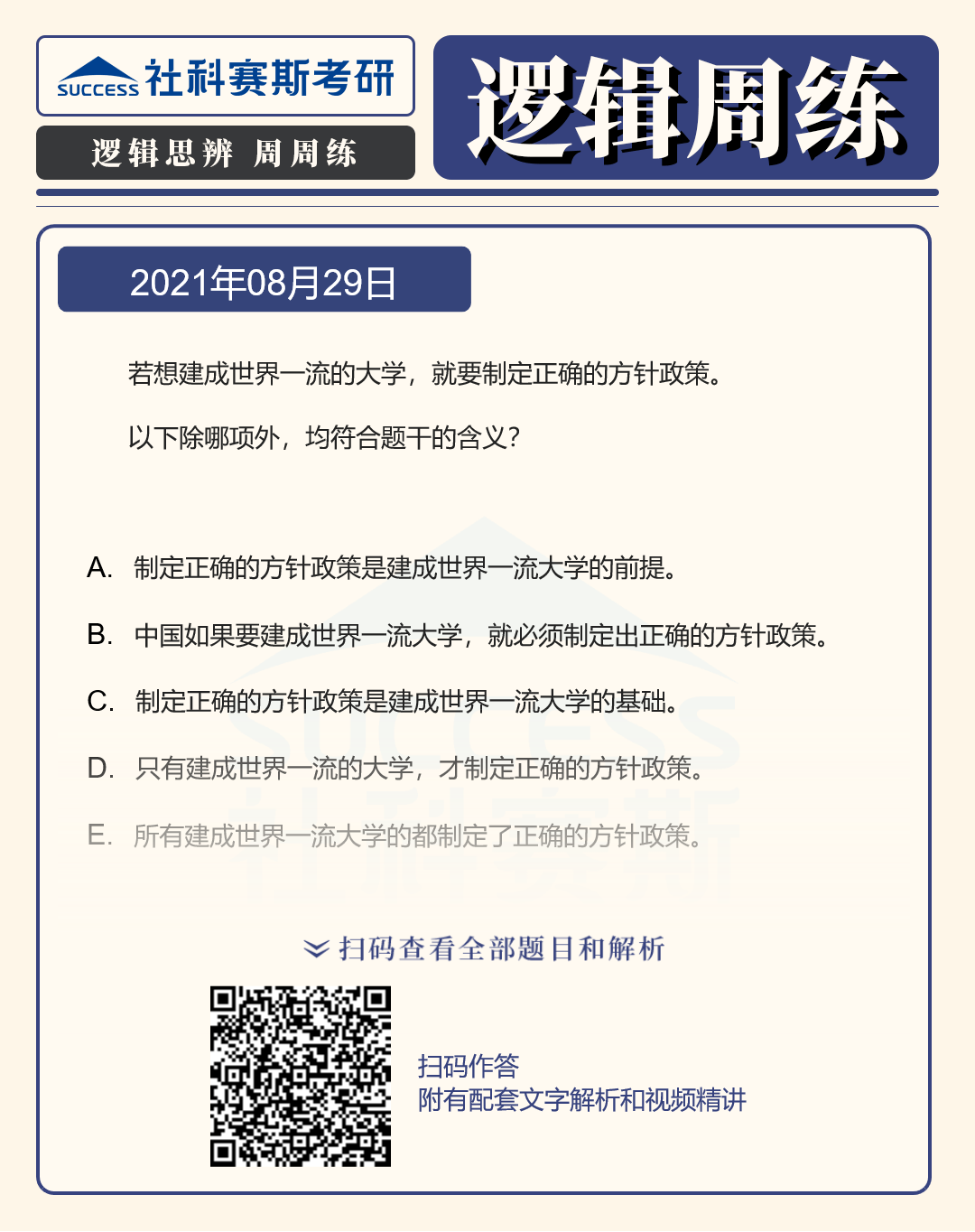 以上就是社科賽斯考研網(wǎng)小編為大家整理邏輯專項(xiàng)練習(xí):8月29日邏輯專項(xiàng)練習(xí)及答案的全部?jī)?nèi)容,希望各位考生堅(jiān)持利用起來(lái),想要獲取更多內(nèi)容請(qǐng)持續(xù)關(guān)注社科賽斯考研網(wǎng)。