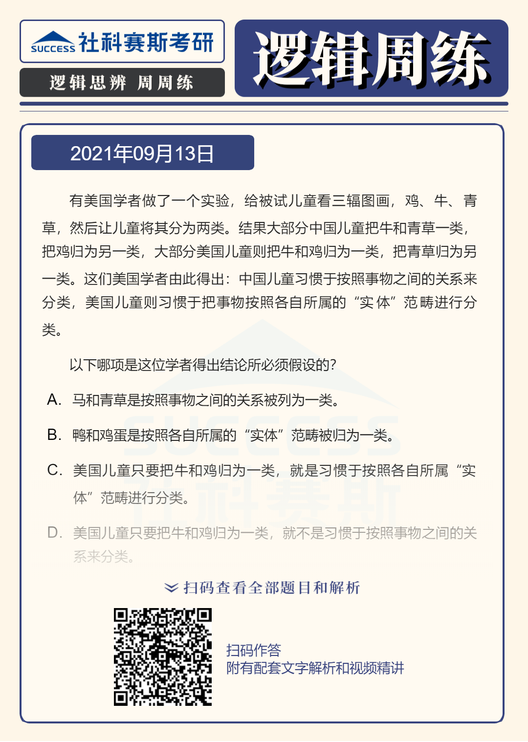 邏輯思辨周周練,考研邏輯專項練習,攻克邏輯難關!今天社科賽斯考研網(wǎng)小編整理了“邏輯專項練習:9月13日邏輯專項練習及答案”,希望能對廣大考生有所幫助!