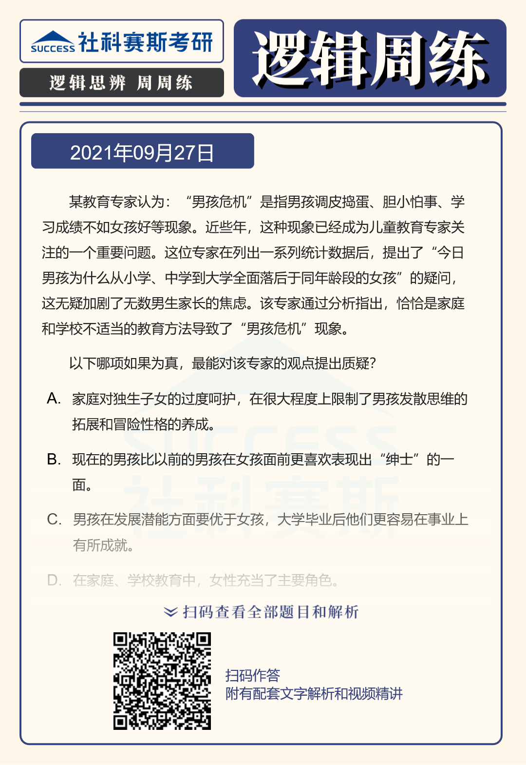 以上就是社科賽斯考研網(wǎng)小編為大家整理邏輯專項(xiàng)練習(xí):9月27日邏輯專項(xiàng)練習(xí)及答案的全部?jī)?nèi)容,希望各位考生堅(jiān)持利用起來,想要獲取更多內(nèi)容請(qǐng)持續(xù)關(guān)注社科賽斯考研網(wǎng)。