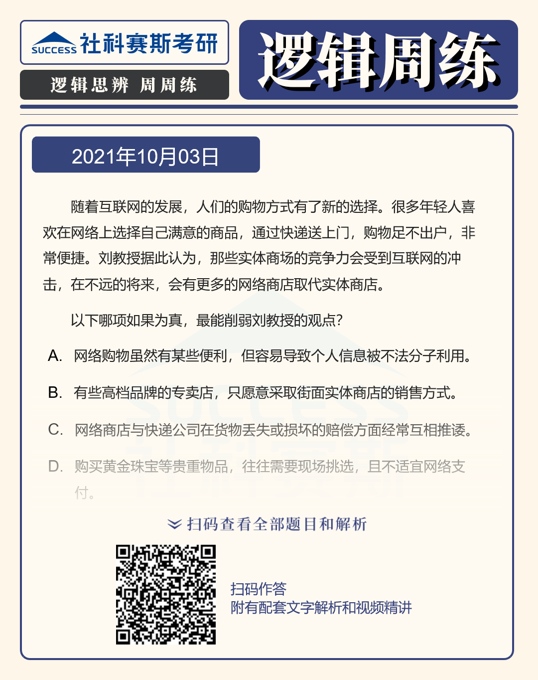 以上就是社科賽斯考研網(wǎng)小編為大家整理邏輯專項(xiàng)練習(xí):10月3日邏輯專項(xiàng)練習(xí)及答案的全部?jī)?nèi)容,希望各位考生堅(jiān)持利用起來,想要獲取更多內(nèi)容請(qǐng)持續(xù)關(guān)注社科賽斯考研網(wǎng)。