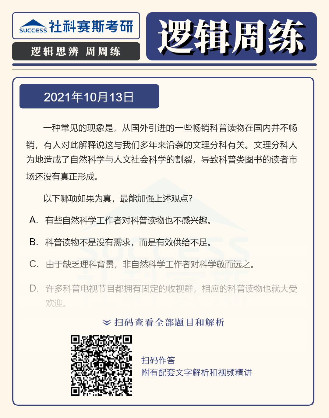 以上就是社科賽斯考研網(wǎng)小編為大家整理邏輯專項(xiàng)練習(xí):10月13日邏輯專項(xiàng)練習(xí)及答案的全部內(nèi)容,希望各位考生堅(jiān)持利用起來,想要獲取更多內(nèi)容請持續(xù)關(guān)注社科賽斯考研網(wǎng)。