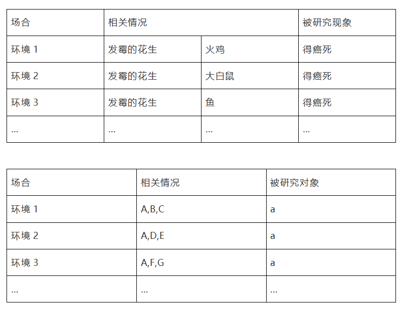 1960年,英國(guó)某農(nóng)場(chǎng)十萬只火雞和小鴨吃了發(fā)霉的花生,在幾個(gè)月內(nèi)得癌癥死了。后來,用這種花生喂羊、貓、鴿子等動(dòng)物,又發(fā)生了同樣的結(jié)果。1963年,有人又用發(fā)了霉的花生喂大白鼠、魚和雪貂,也都紛紛得癌而死,上述各種動(dòng)物患癌癥的前提條件中,對(duì)象、時(shí)間、環(huán)境都不同,唯一共同的因素就是吃了發(fā)霉的花生。于是,人們推斷:吃了發(fā)霉的花生可能是這些動(dòng)物得癌死亡的原因。后來通過化驗(yàn)證明,發(fā)霉的花生內(nèi)含黃曲霉素,黃曲霉素是致癌物質(zhì)。這就是“求同”。