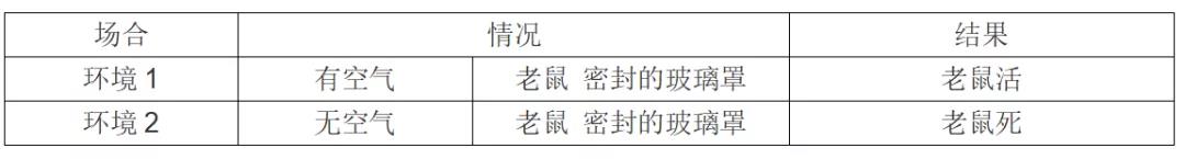 在一個(gè)密封的有空氣的玻璃罩內(nèi),放一只老鼠,老鼠神態(tài)自若,然后抽凈罩內(nèi)空氣,老鼠馬上窒息,隨即死亡。兩個(gè)場(chǎng)合中,密封的玻璃罩、老鼠等情況均相同,唯一不同的是是否有空氣。有空氣老鼠活動(dòng)正常,無(wú)空氣老鼠窒息死亡。于是得出結(jié)論:沒(méi)有空氣是老鼠死亡的原因。