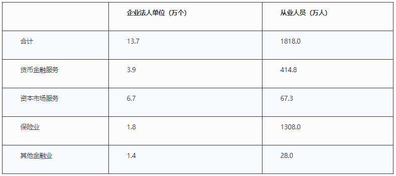 國家統(tǒng)計局第四次全國經(jīng)濟普查公報結(jié)果顯示,2018年末,全國共有金融業(yè)企業(yè)法人單位13.7萬個,從業(yè)人員1818.0萬人(詳見表1),比2013年第三次普查時,金融業(yè)企業(yè)法人單位增加10.8萬個,從業(yè)人員增加1304.1萬人。