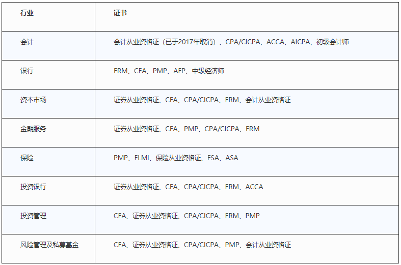 與此同時,國際認(rèn)證資格證書近年來在國內(nèi)逐漸興起,并越來越被金融機構(gòu)所認(rèn)可。雖然各行業(yè)因其職能業(yè)務(wù)內(nèi)容的不同,所認(rèn)可的資格證書也有差異,如表5所示,但事實證明,國際認(rèn)證資格證書因其專業(yè)權(quán)威性,已在求職領(lǐng)域中占有越來越重要的分量。