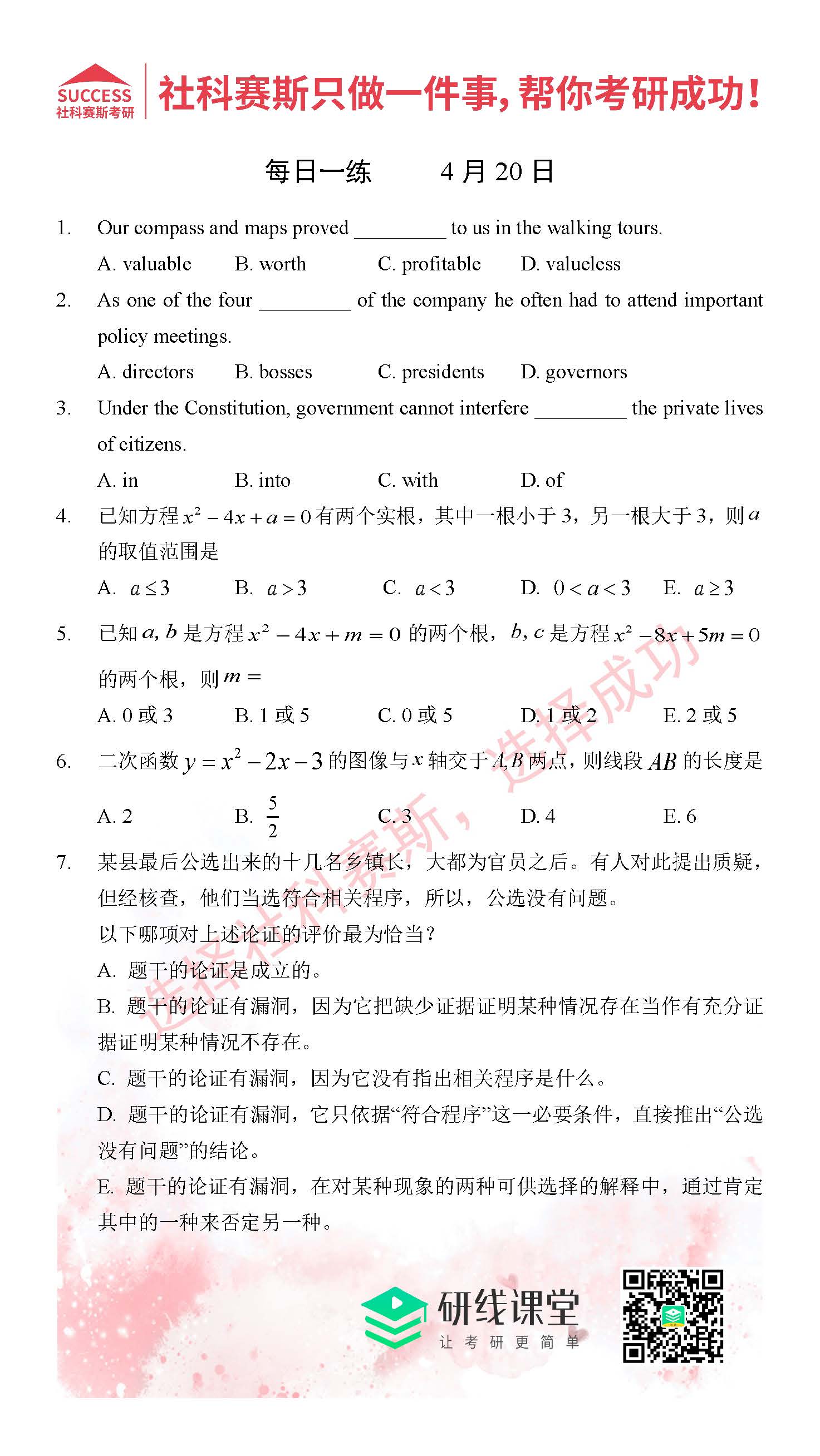 考研是一場持久戰(zhàn),保持良好的學習習慣,是能確保復習高效的關鍵。MBA備考網(wǎng)小編整理了管綜的每日一練,希望能對廣大考生有所幫助。