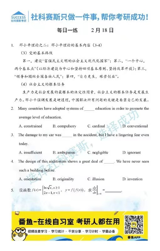考研是一場持久戰(zhàn),保持良好的學(xué)習習慣,是能確保復(fù)習高效的關(guān)鍵。今天社科賽斯考研網(wǎng)小編整理了“2022考研每日一練:2月18日每日一練及答案”的內(nèi)容,希望能對廣大考生有所幫助。