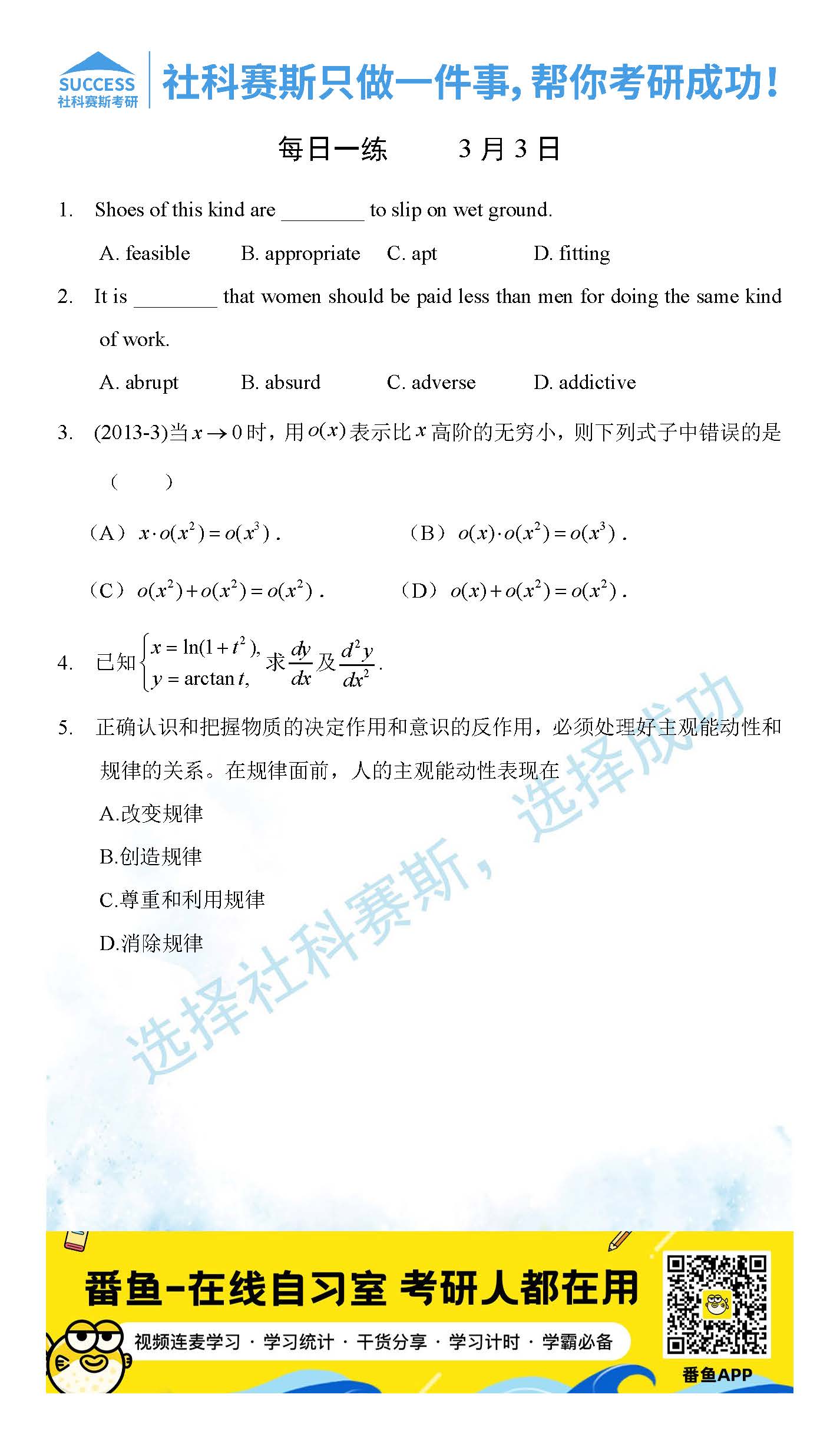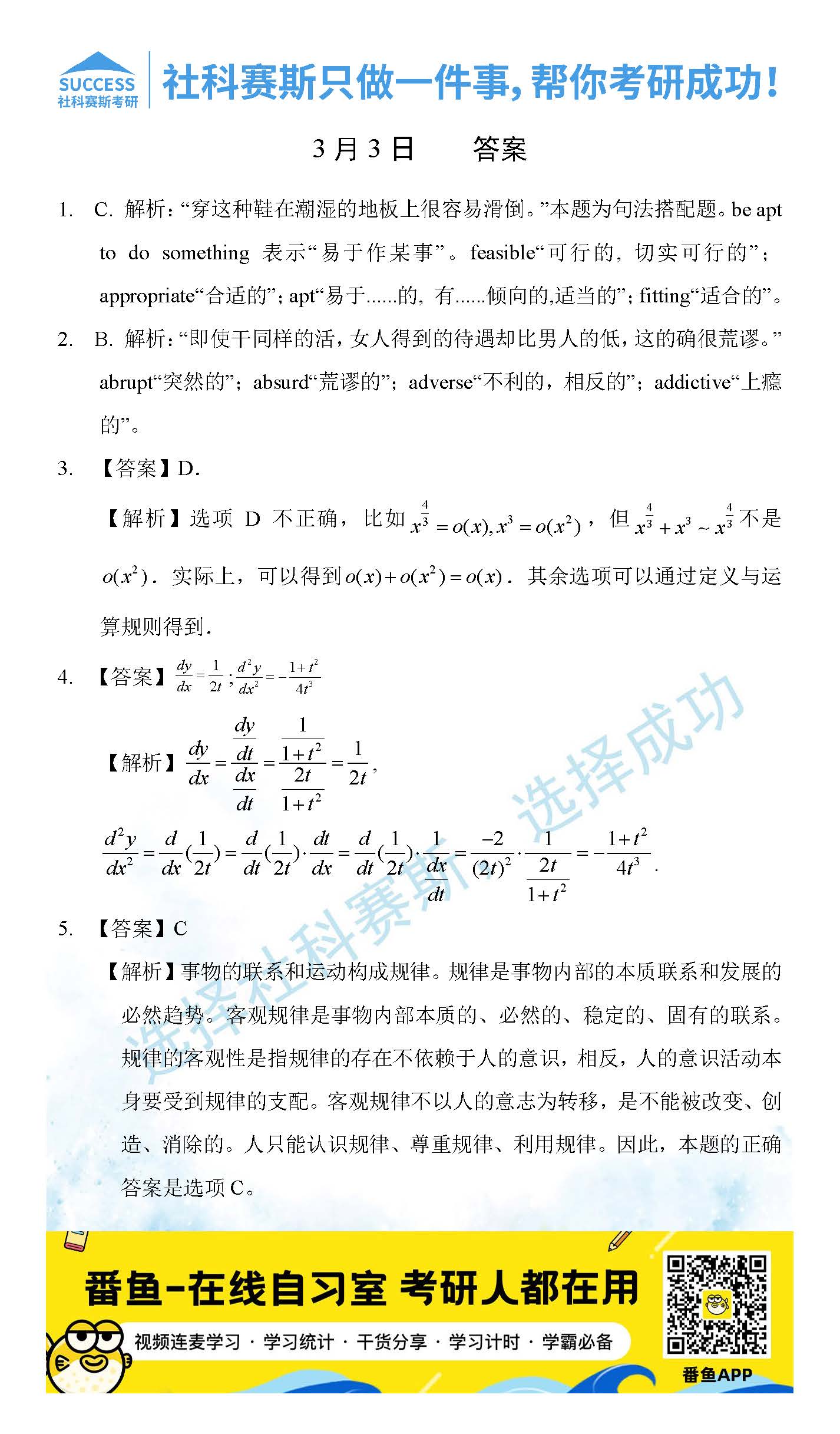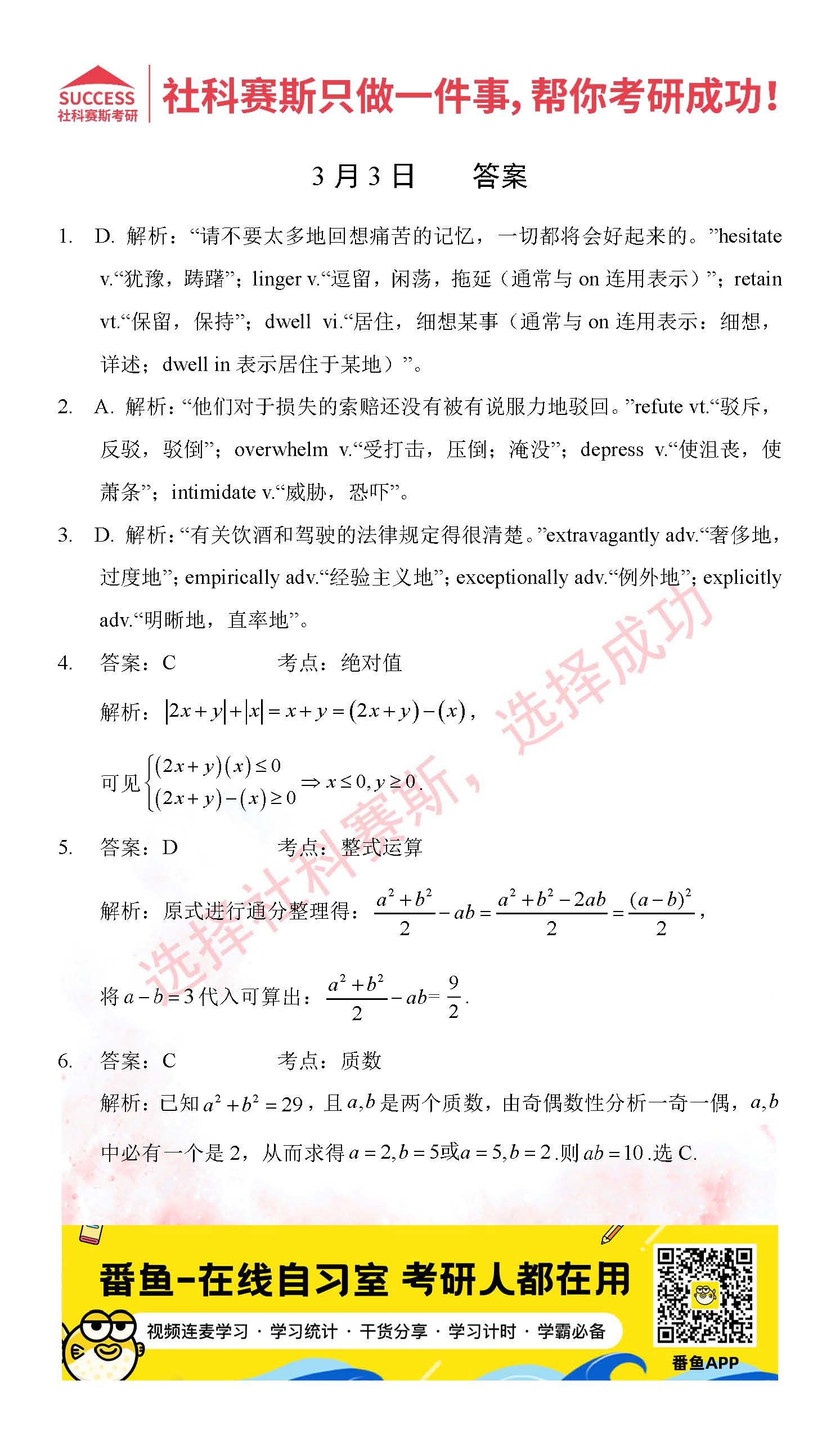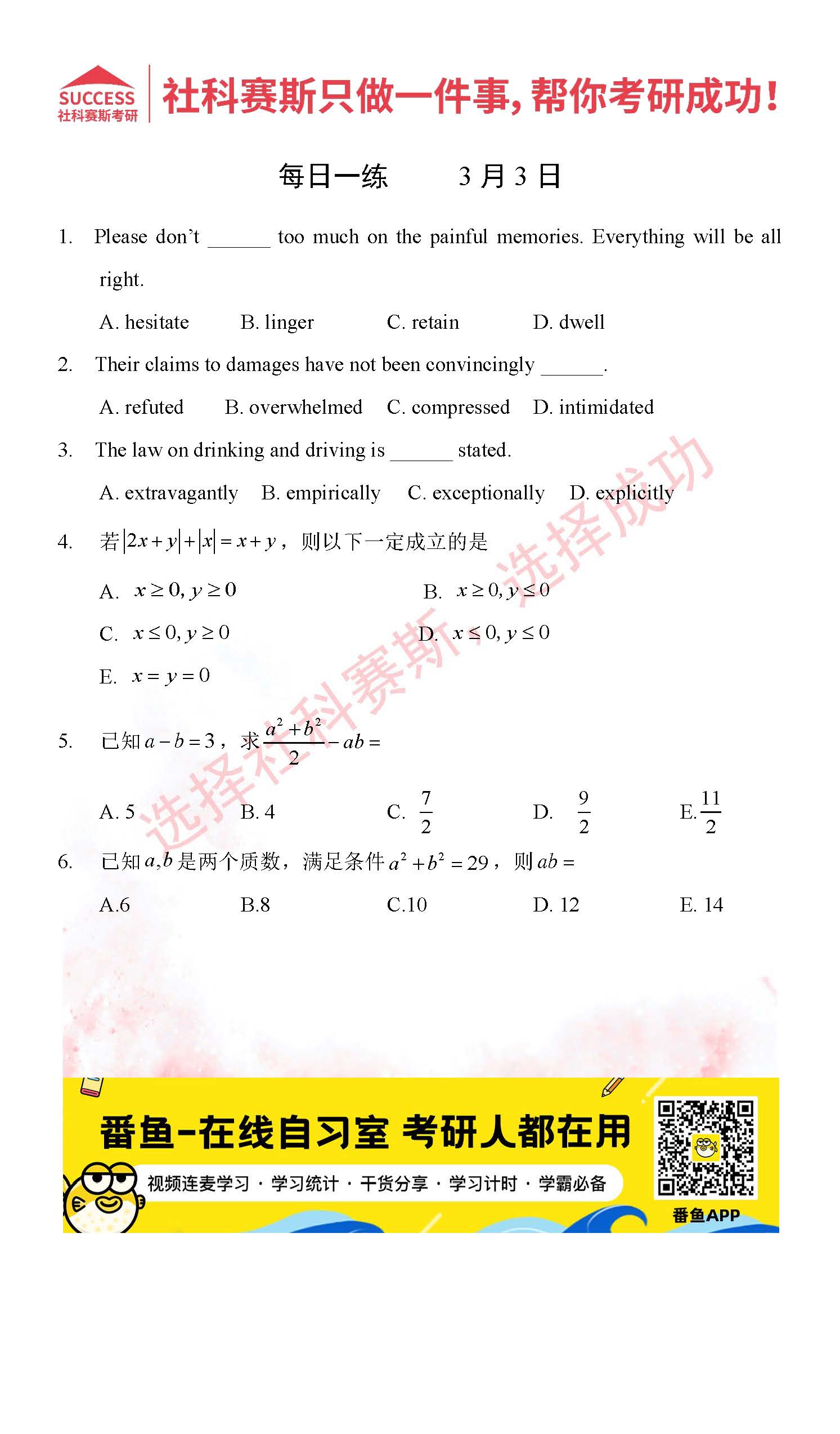 考研是一場持久戰(zhàn),保持良好的學(xué)習(xí)習(xí)慣,是能確保復(fù)習(xí)高效的關(guān)鍵。今天社科賽斯考研網(wǎng)小編整理了“2022考研每日一練:3月3日管理類聯(lián)考每日一練及答案”的內(nèi)容,希望能對廣大考生有所幫助。