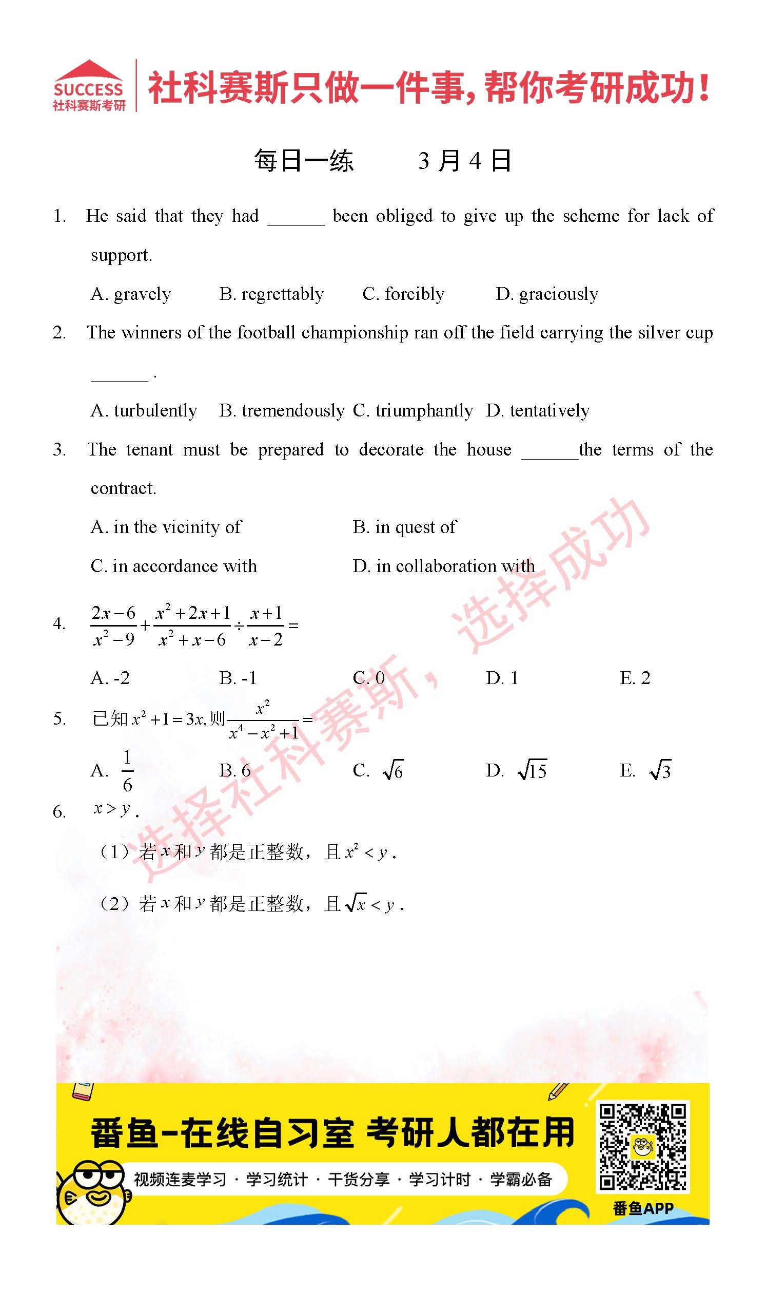 考研是一場持久戰(zhàn),保持良好的學習習慣,是能確保復習高效的關鍵。今天社科賽斯考研網小編整理了“2022考研每日一練:3月4日管理類聯(lián)考每日一練及答案”的內容,希望能對廣大考生有所幫助。