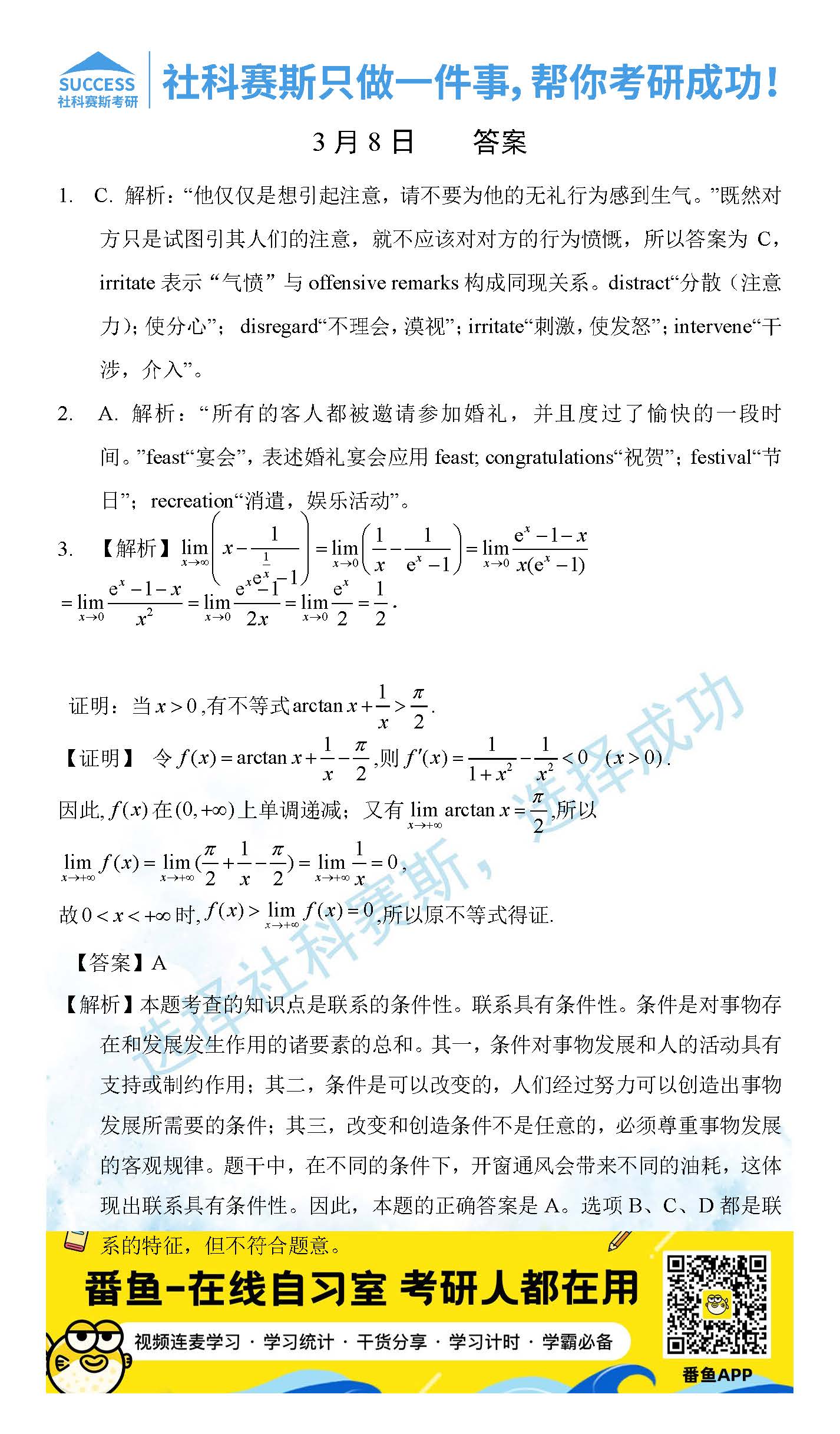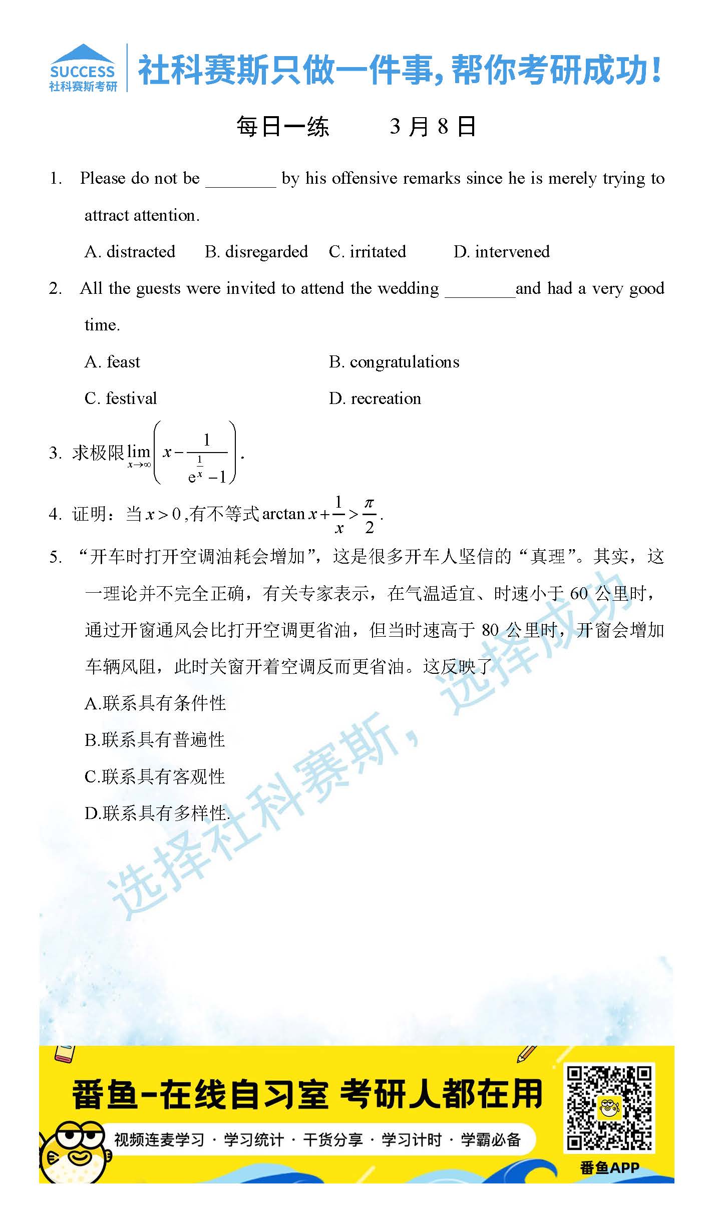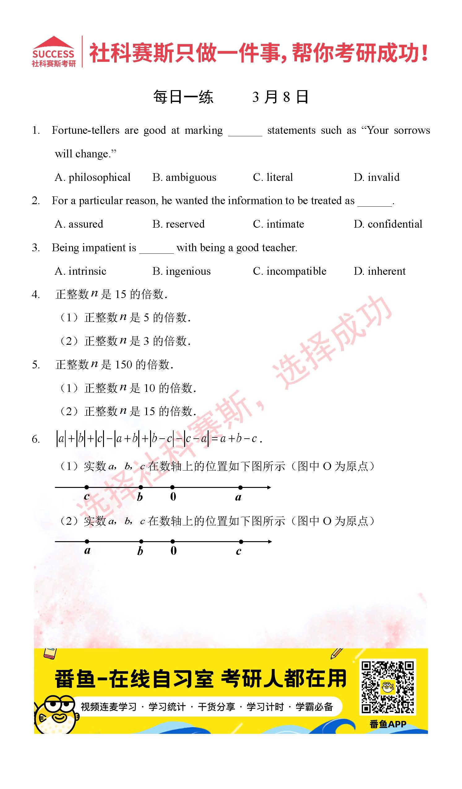 以上就是社科賽斯考研網(wǎng)小編為大家整理2022考研每日一練:3月8日管理類聯(lián)考每日一練及答案的全部內(nèi)容,希望各位考生堅持利用起來,更多每日一練內(nèi)容請持續(xù)關(guān)注社科賽斯考研網(wǎng)