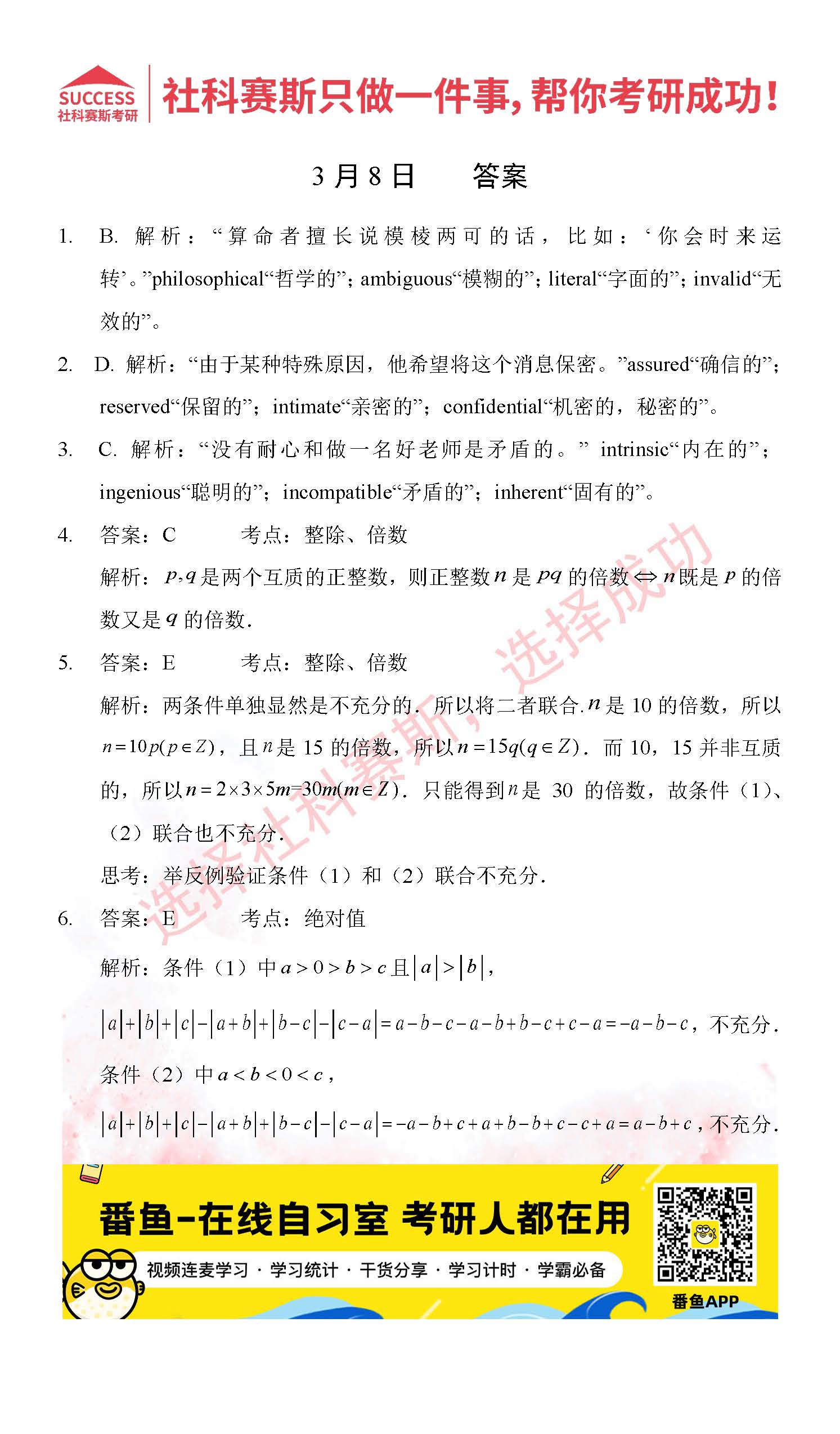考研是一場持久戰(zhàn),保持良好的學(xué)習(xí)習(xí)慣,是能確保復(fù)習(xí)高效的關(guān)鍵。今天社科賽斯考研網(wǎng)小編整理了“2022考研每日一練:3月8日管理類聯(lián)考每日一練及答案”的內(nèi)容,希望能對廣大考生有所幫助。