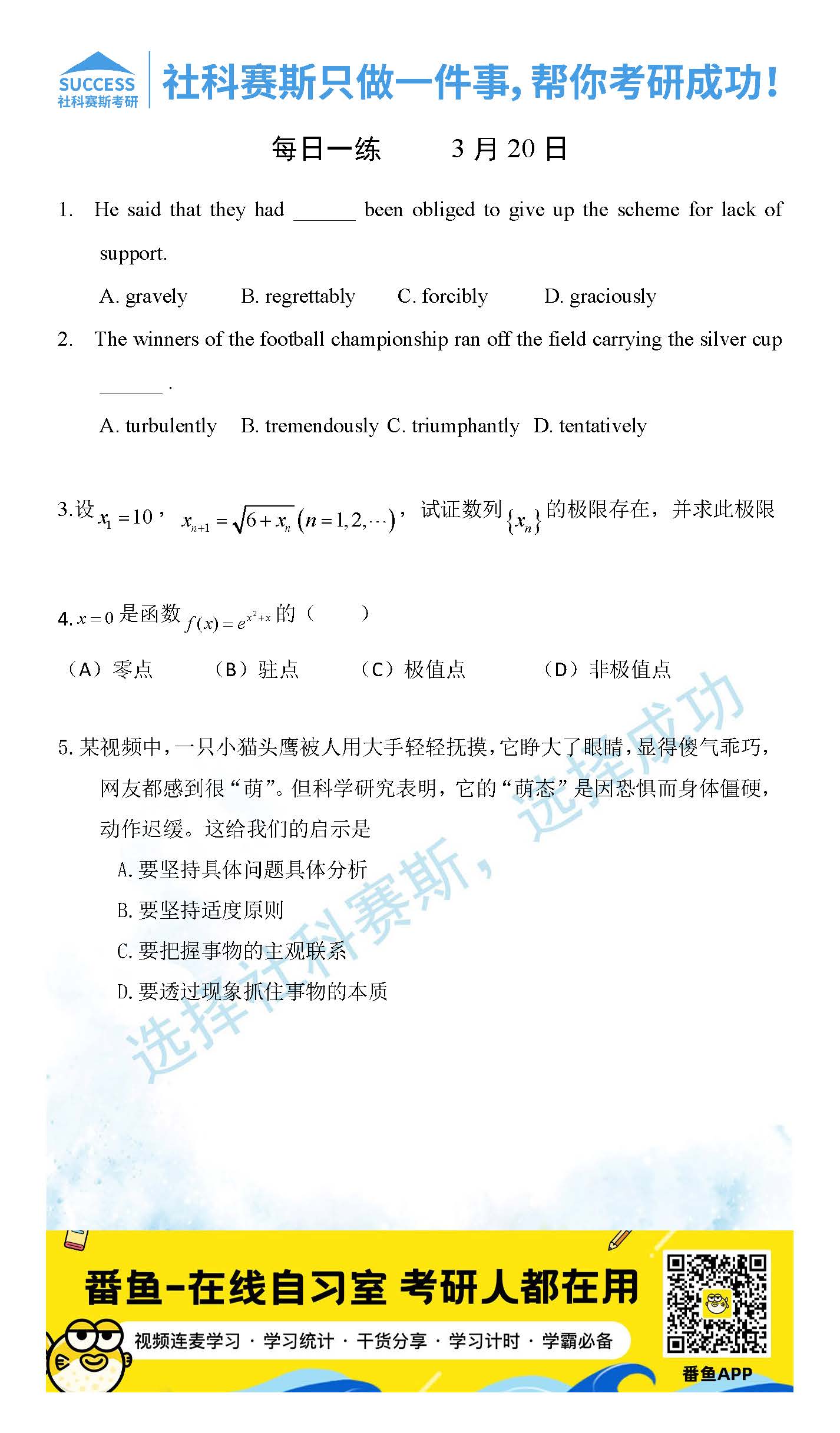 考研是一場持久戰(zhàn),保持良好的學(xué)習(xí)習(xí)慣,是能確保復(fù)習(xí)高效的關(guān)鍵。今天社科賽斯考研網(wǎng)小編整理了“2022考研每日一練:3月20日管理類聯(lián)考每日一練及答案”的內(nèi)容,希望能對廣大考生有所幫助。