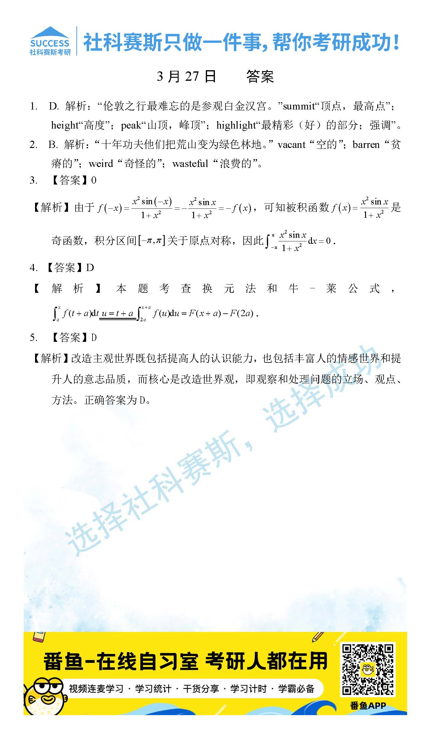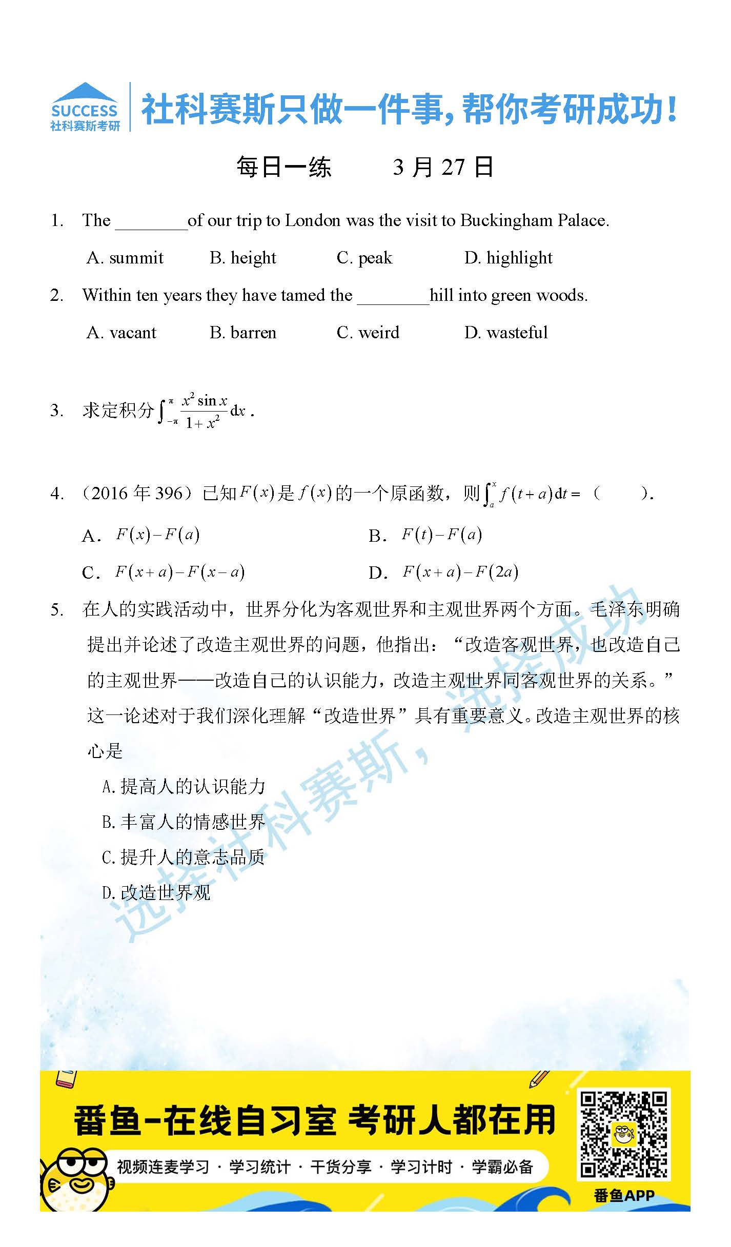 考研是一場持久戰(zhàn),保持良好的學習習慣,是能確保復習高效的關(guān)鍵。今天社科賽斯考研網(wǎng)小編整理了“2022考研每日一練:3月27日管理類聯(lián)考每日一練及答案”的內(nèi)容,希望能對廣大考生有所幫助。