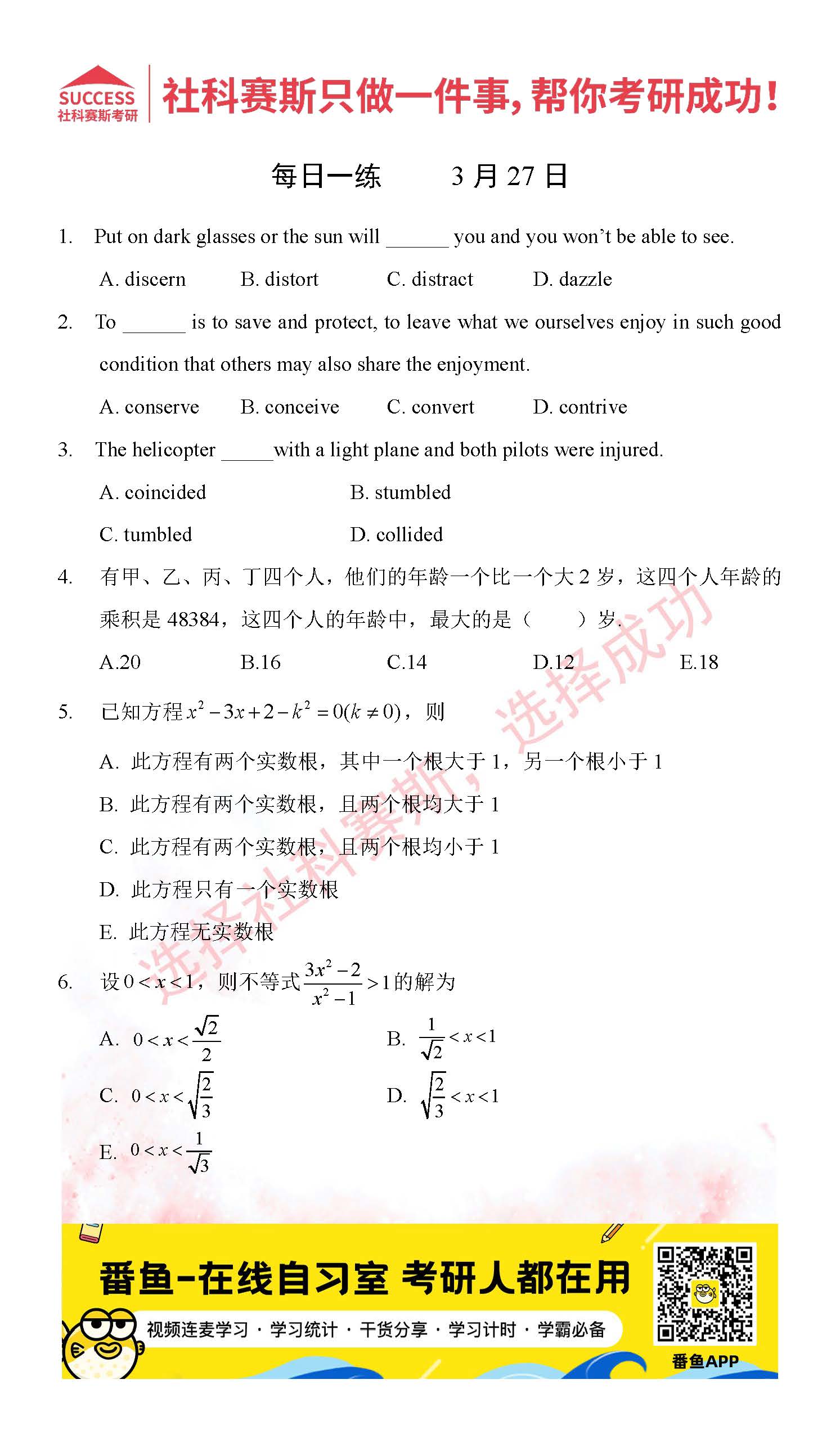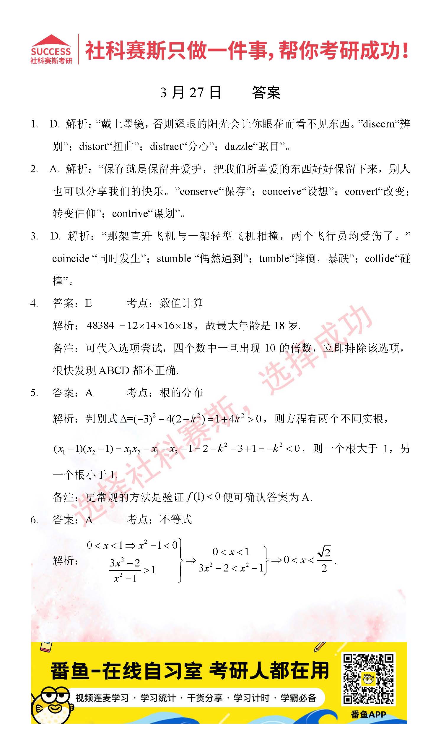 ?以上就是社科賽斯考研網(wǎng)小編為大家整理2022考研每日一練:3月27日管理類聯(lián)考每日一練及答案的全部內(nèi)容,希望各位考生堅持利用起來,更多每日一練內(nèi)容請持續(xù)關(guān)注社科賽斯考研網(wǎng)