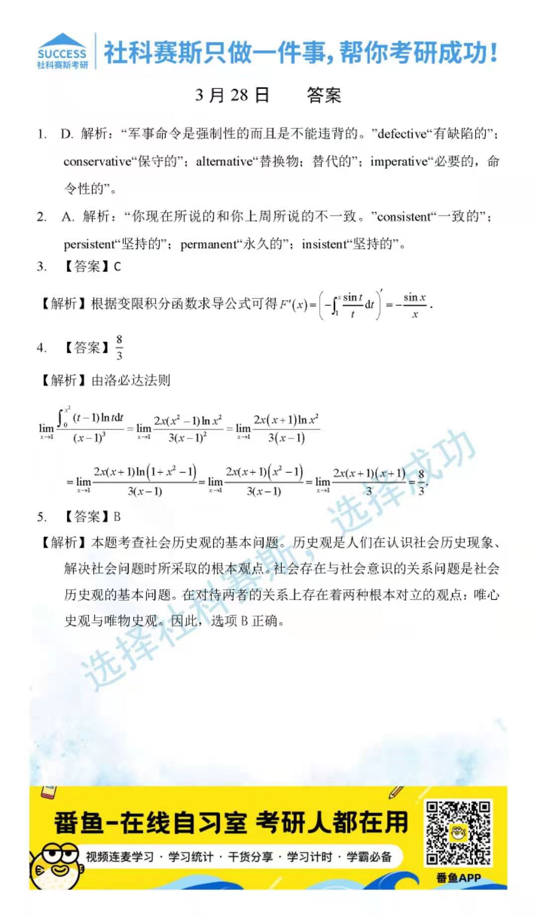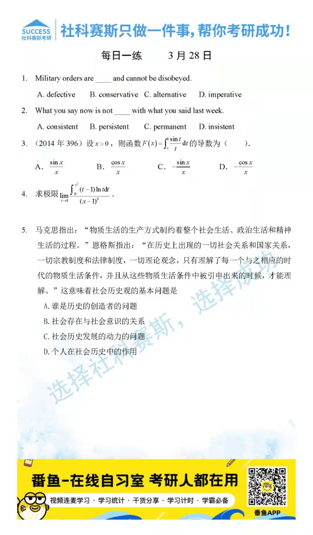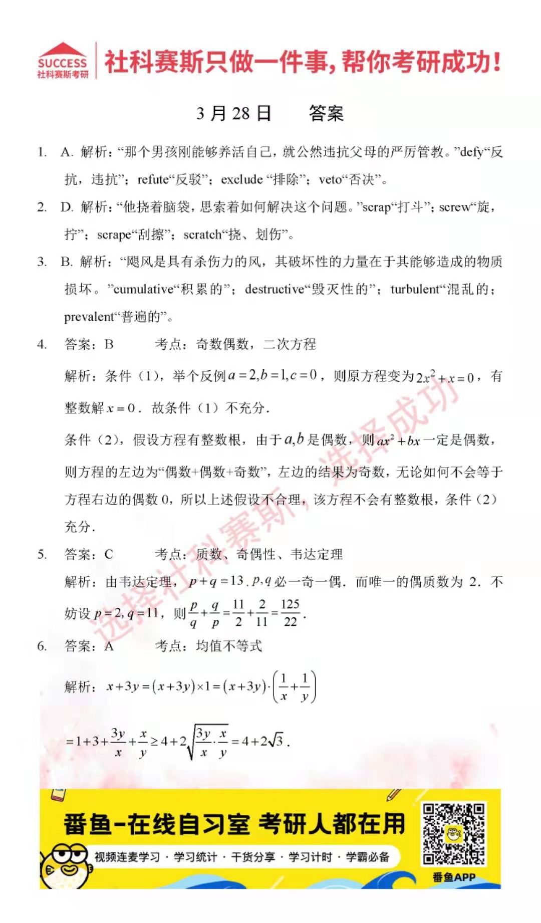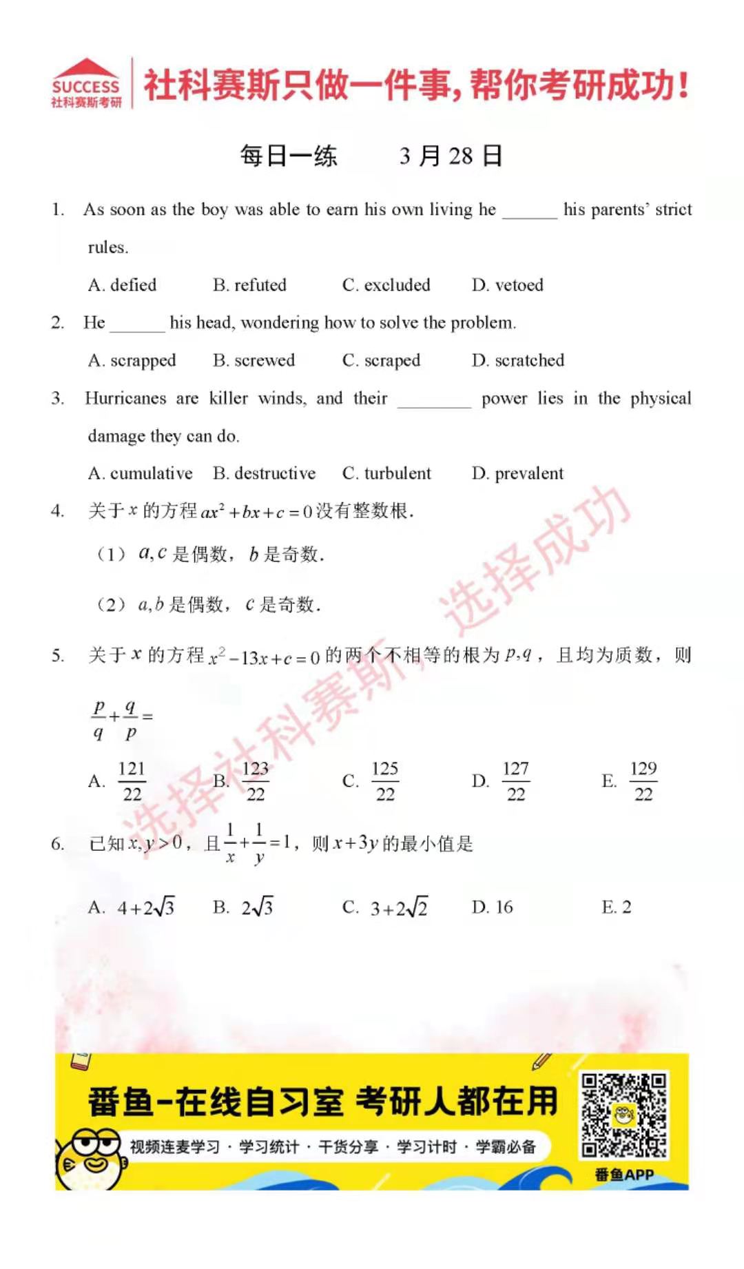 考研是一場(chǎng)持久戰(zhàn),保持良好的學(xué)習(xí)習(xí)慣,是能確保復(fù)習(xí)高效的關(guān)鍵。今天社科賽斯考研網(wǎng)小編整理了“2022考研每日一練:3月28日管理類(lèi)聯(lián)考每日一練及答案”的內(nèi)容,希望能對(duì)廣大考生有所幫助。