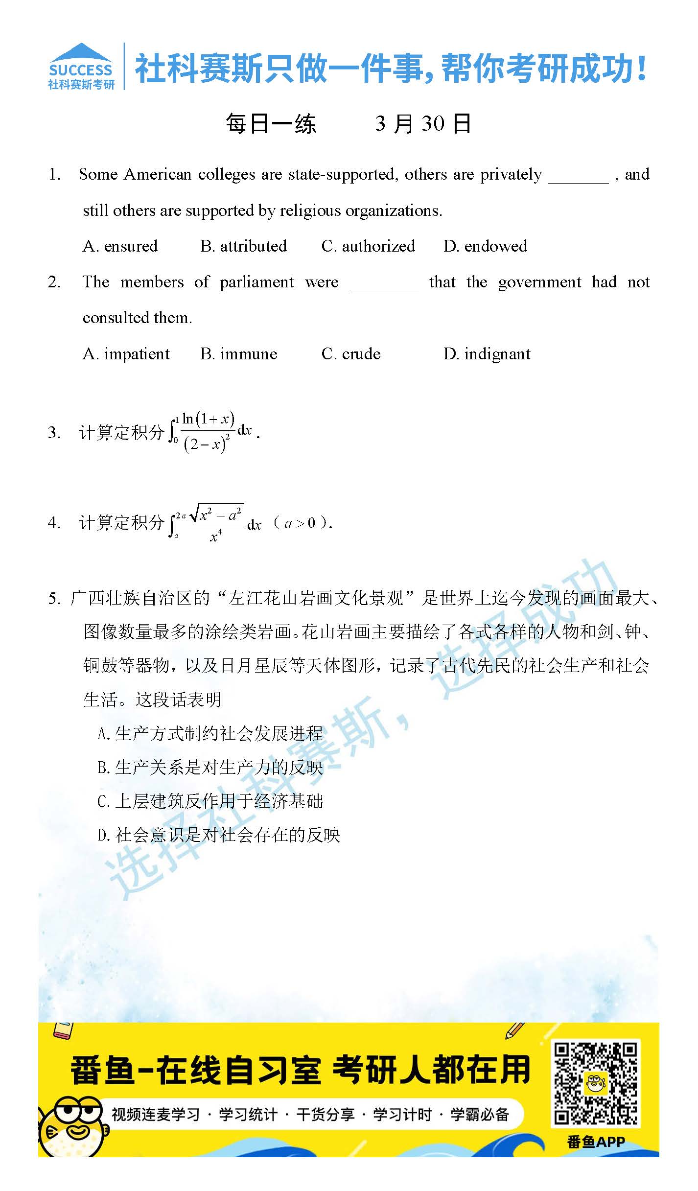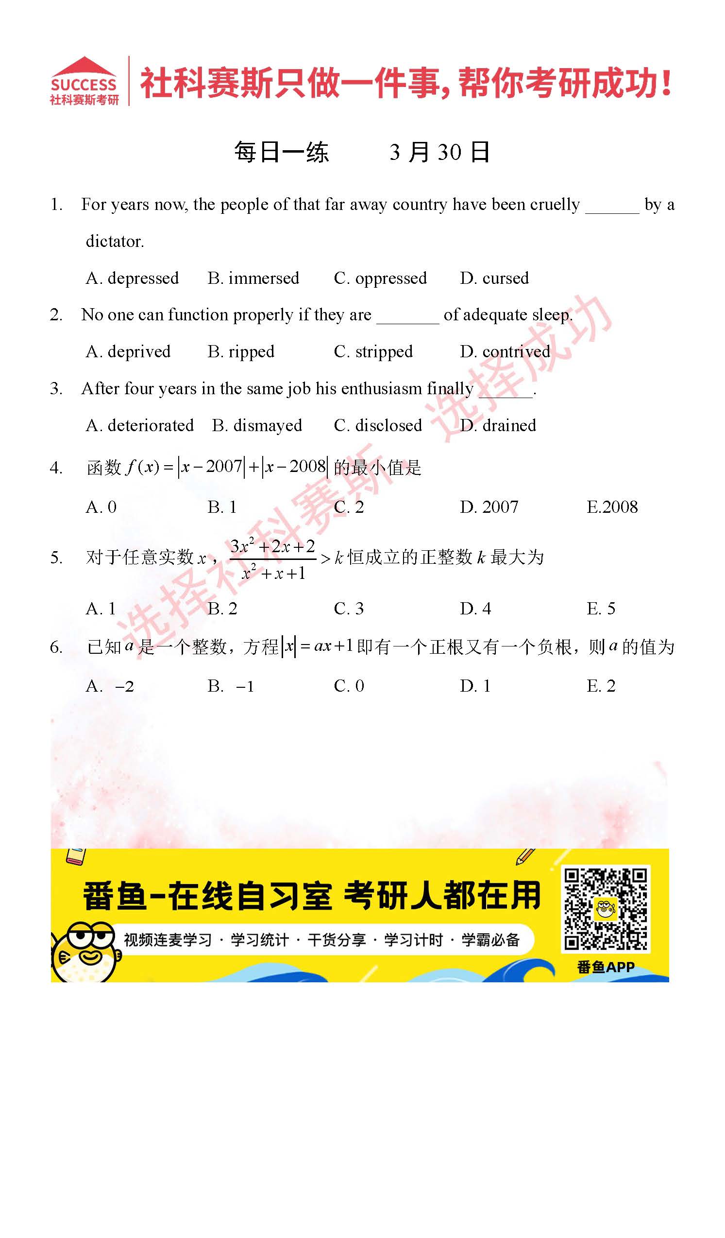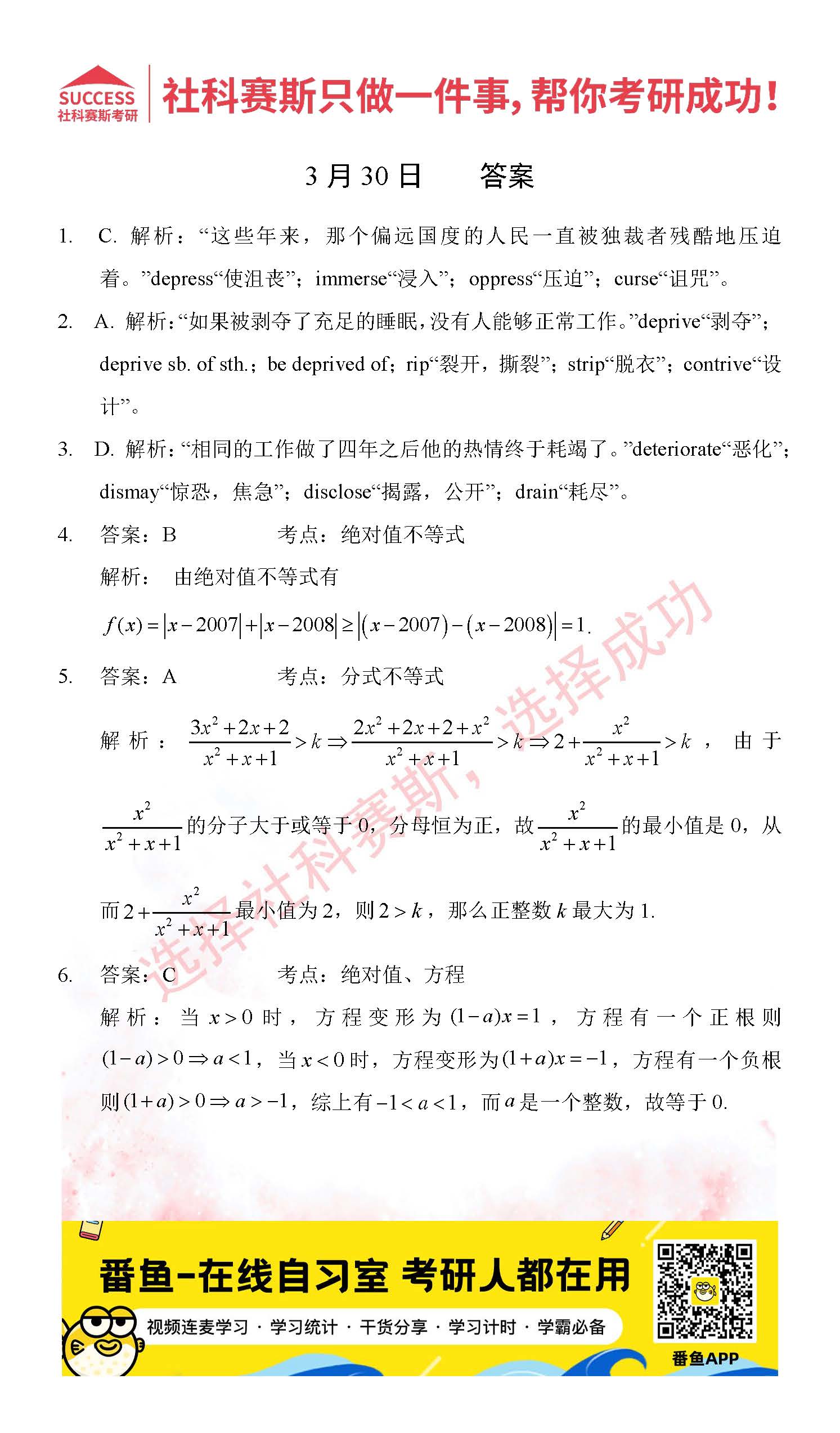 ?以上就是社科賽斯考研網(wǎng)小編為大家整理2022考研每日一練:3月30日管理類聯(lián)考每日一練及答案的全部?jī)?nèi)容,希望各位考生堅(jiān)持利用起來,更多每日一練內(nèi)容請(qǐng)持續(xù)關(guān)注社科賽斯考研網(wǎng)。