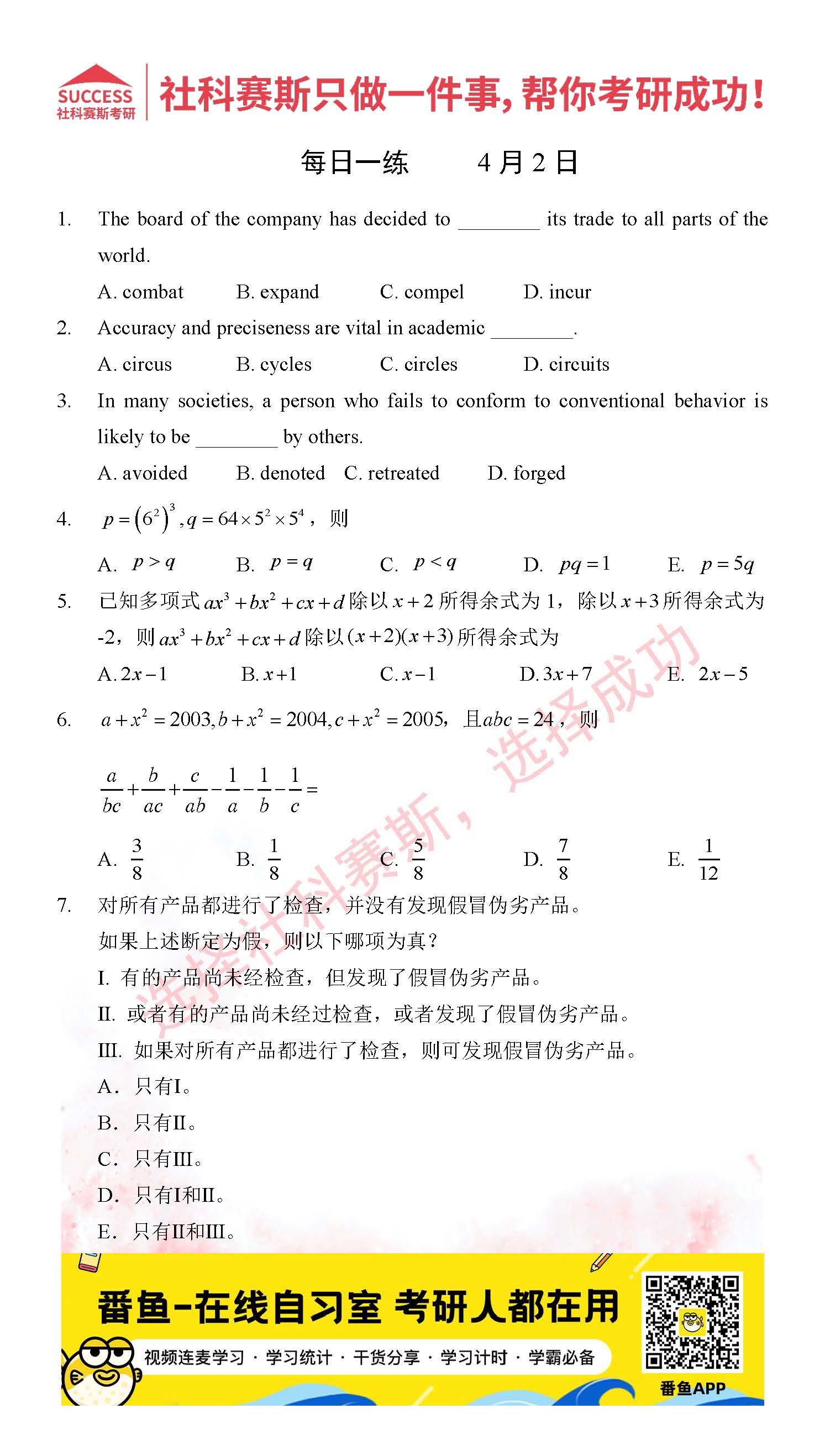 2022考研每日一練:4月2日管理類聯(lián)考每日一練及答案