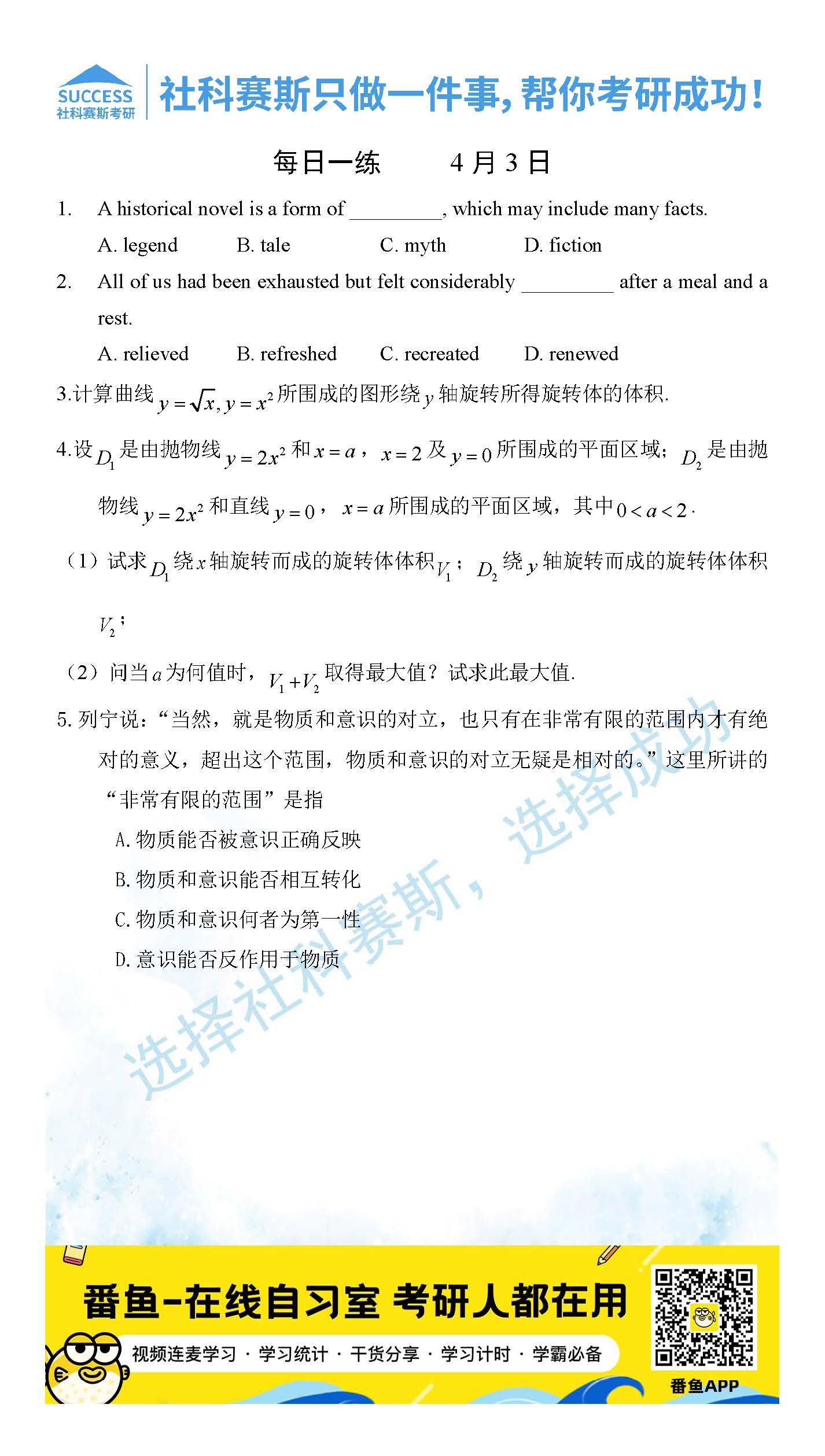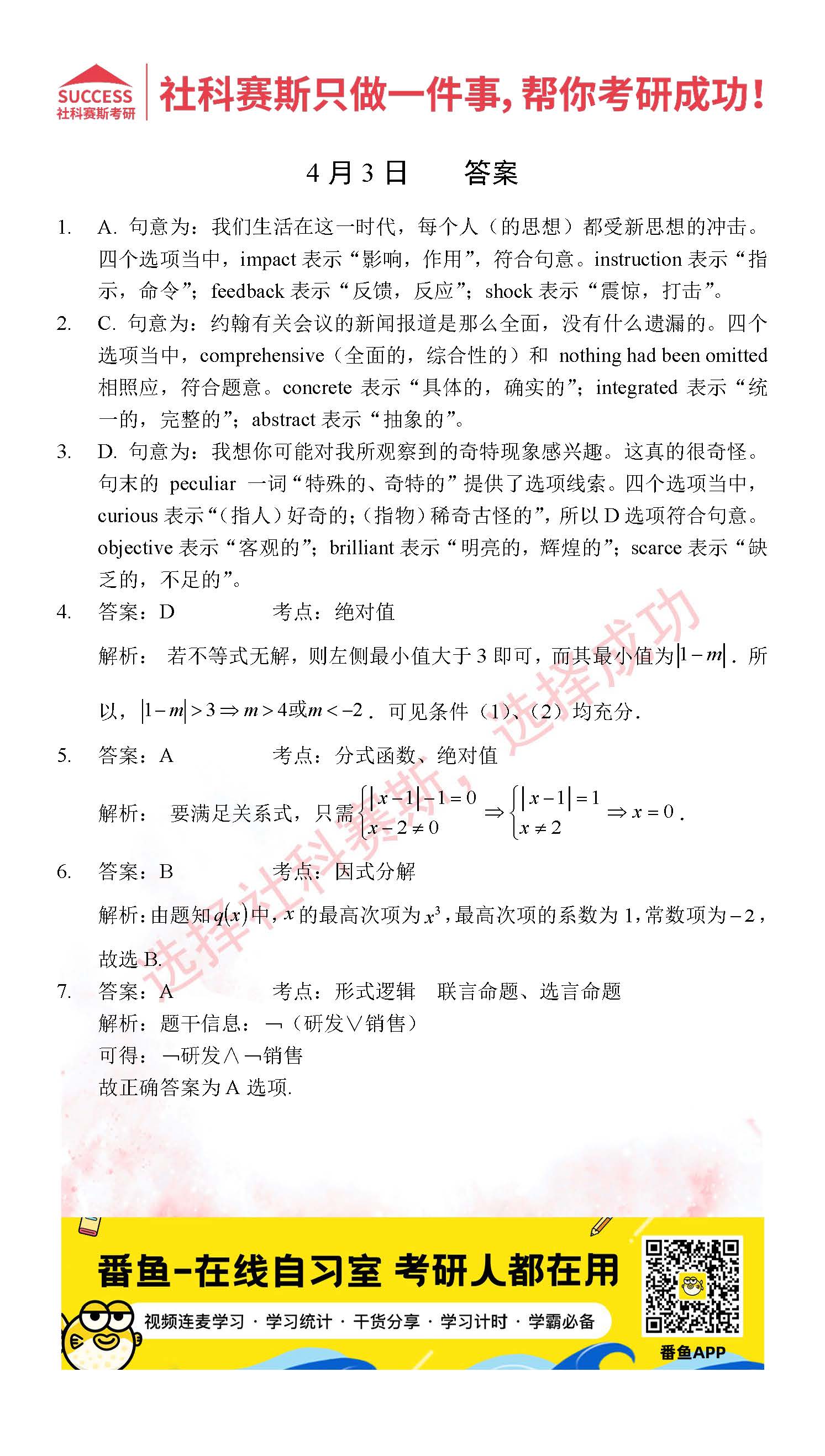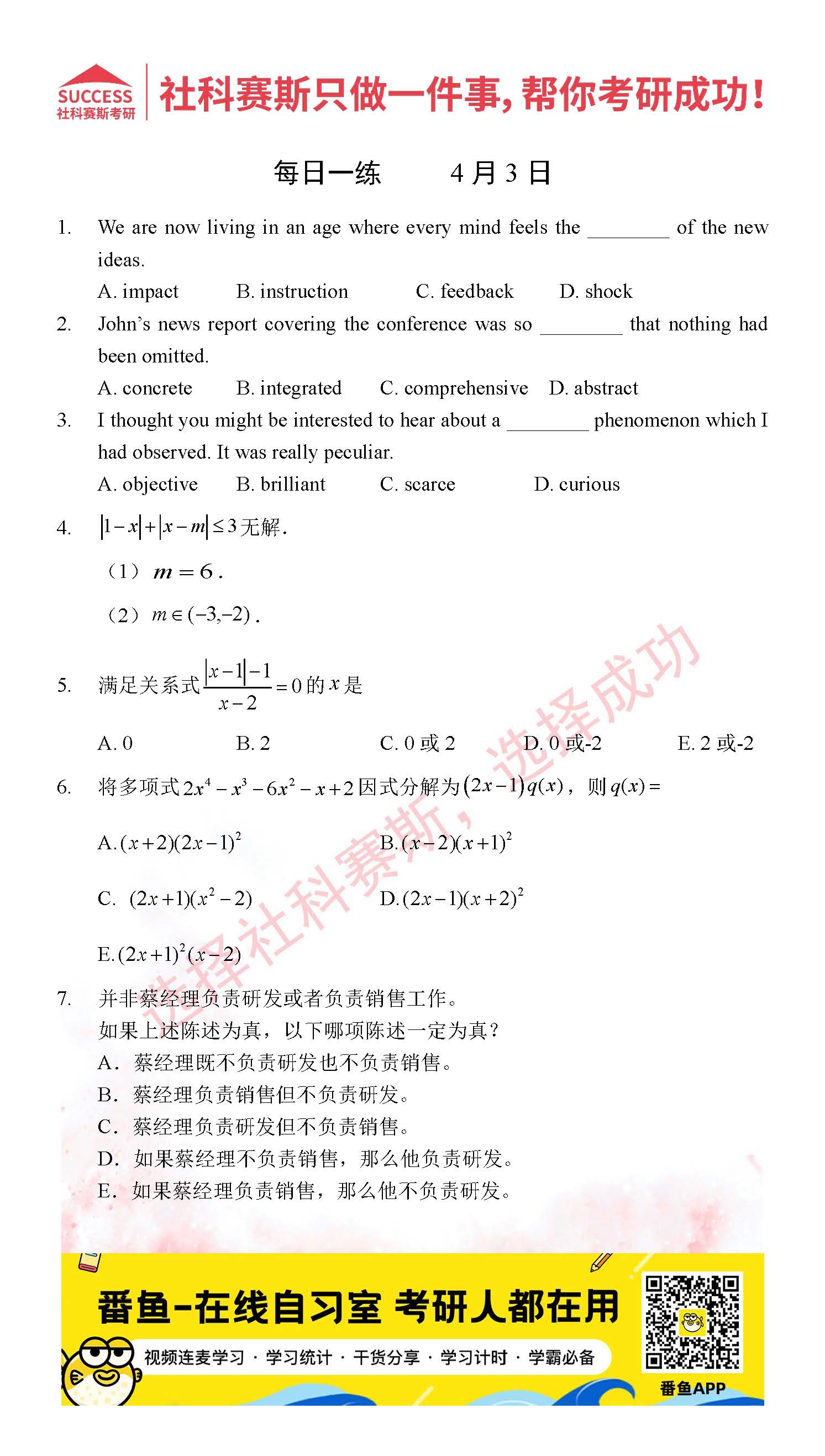 ?以上就是社科賽斯考研網(wǎng)小編為大家整理2022考研每日一練:4月3日管理類聯(lián)考每日一練及答案的全部內(nèi)容,希望各位考生堅持利用起來,更多每日一練內(nèi)容請持續(xù)關(guān)注社科賽斯考研網(wǎng)