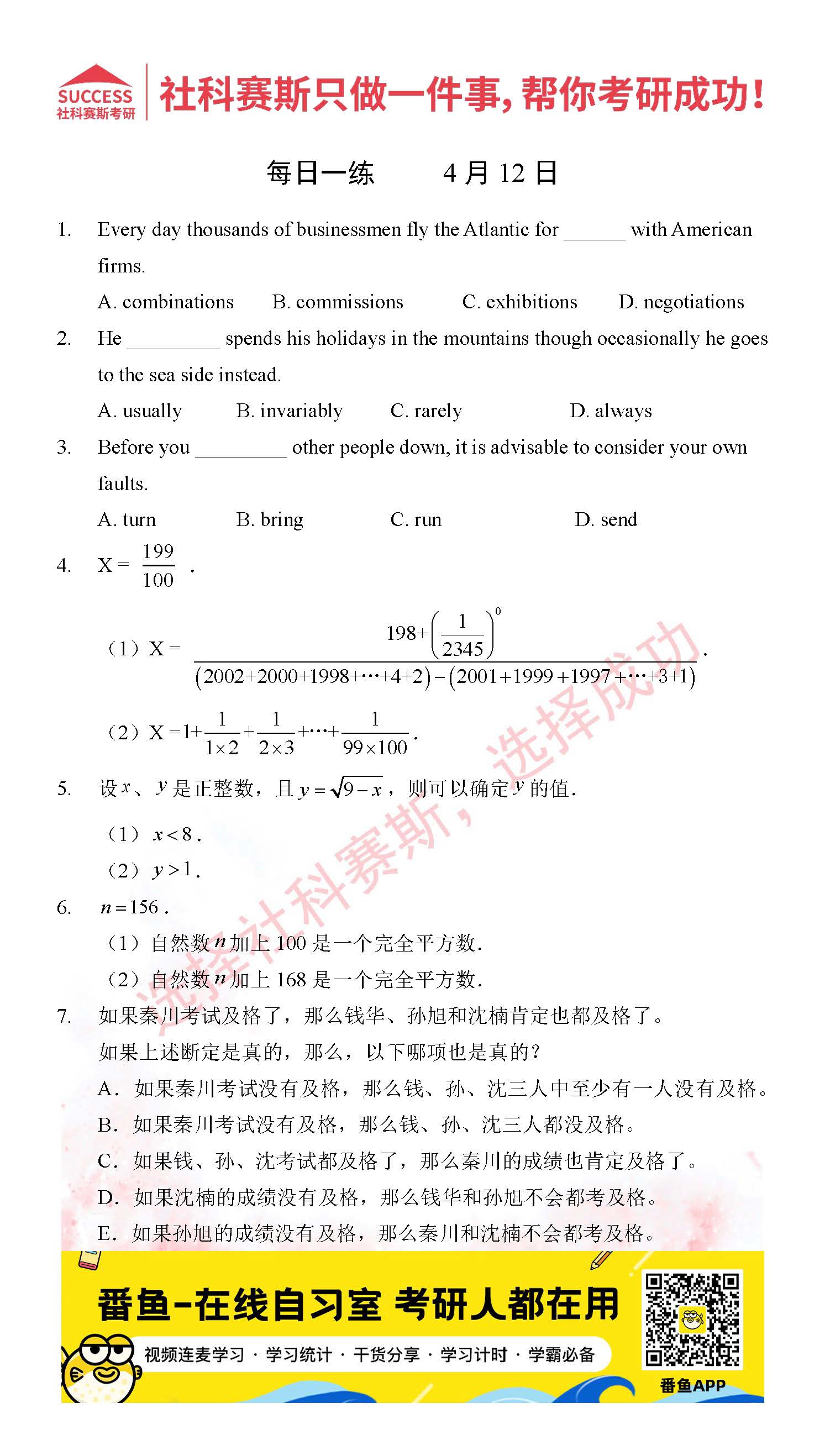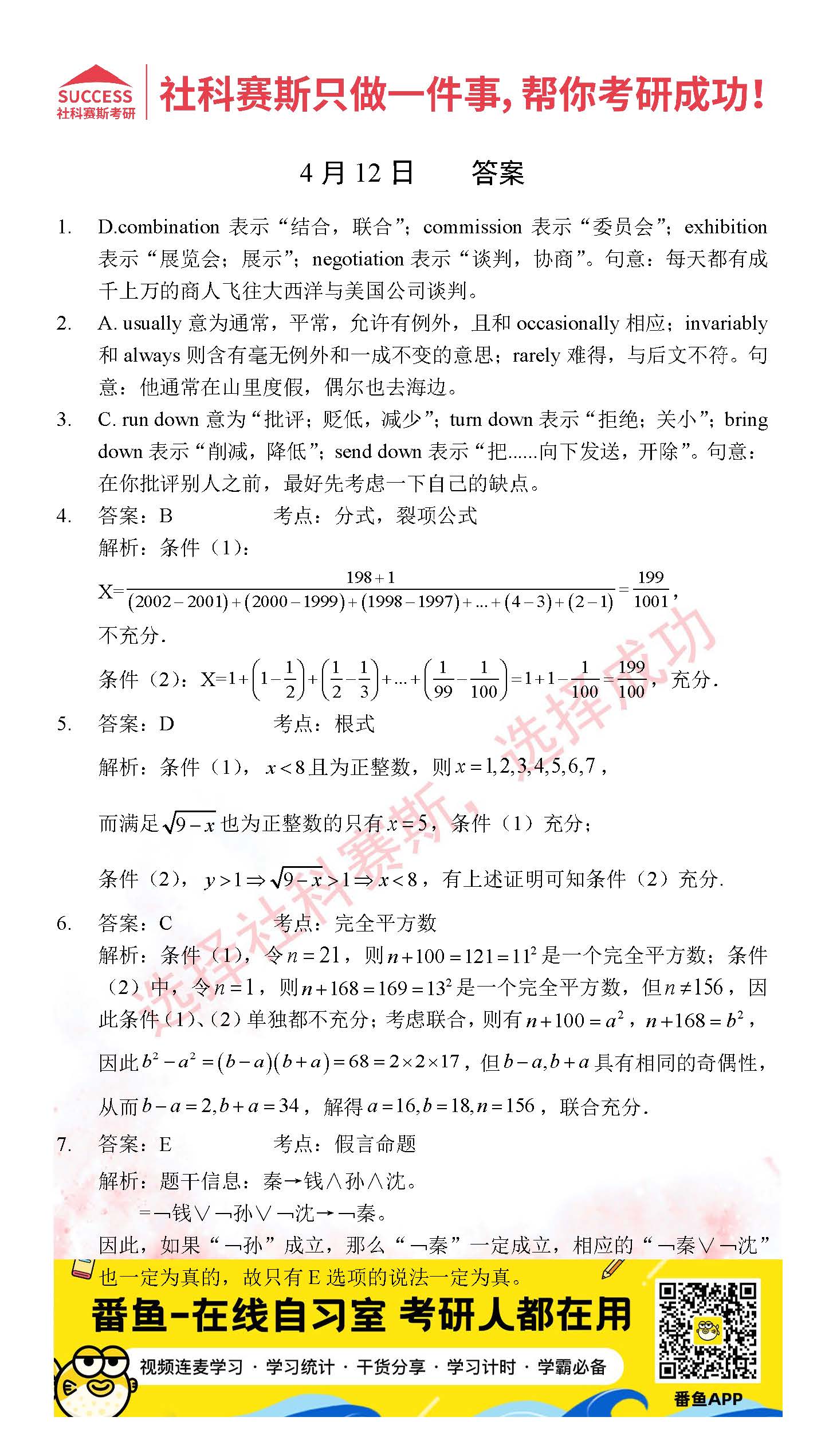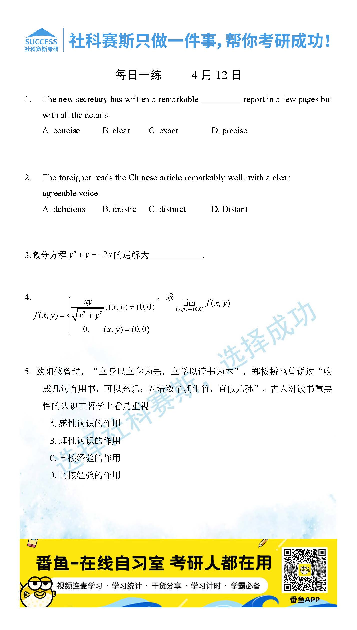 ?以上就是社科賽斯考研網(wǎng)小編為大家整理2022考研每日一練:4月12日管理類聯(lián)考每日一練及答案的全部內容,希望各位考生堅持利用起來,更多每日一練內容請持續(xù)關注社科賽斯考研網(wǎng)。