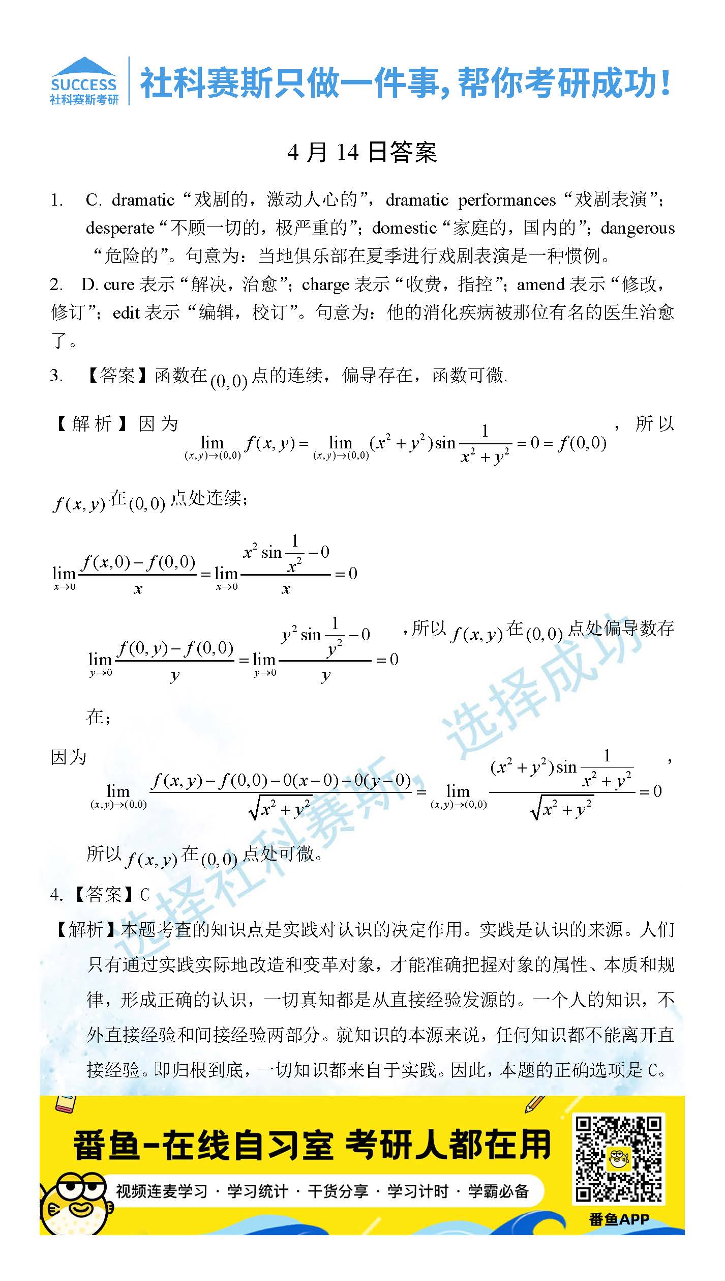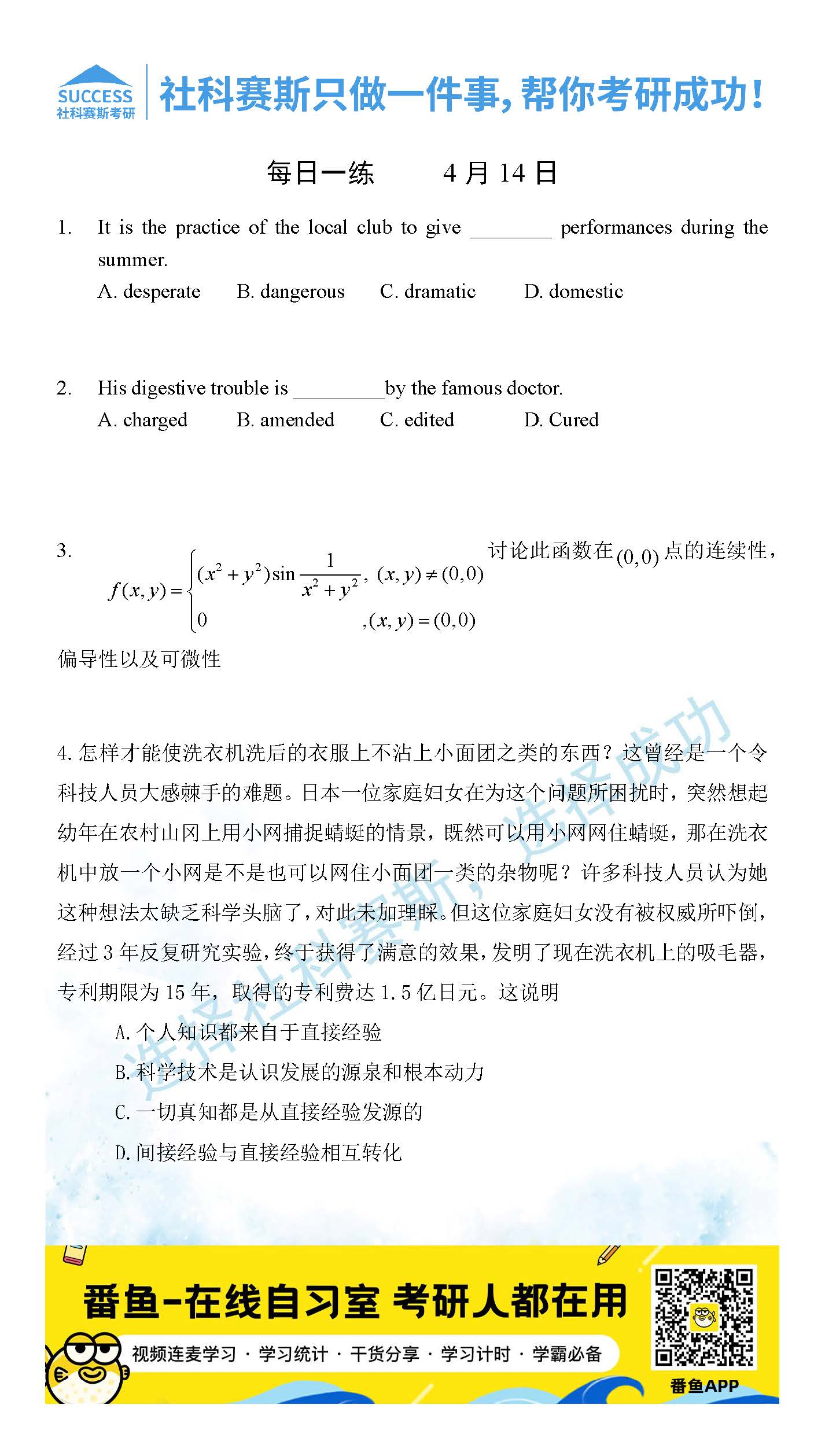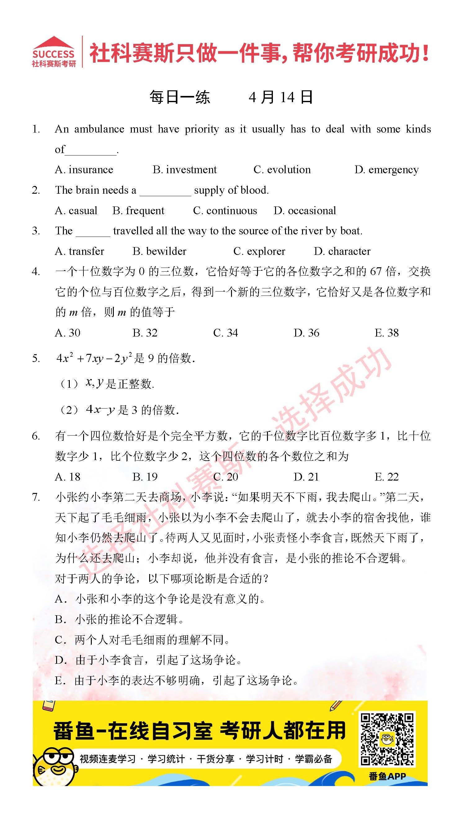 考研是一場(chǎng)持久戰(zhàn),保持良好的學(xué)習(xí)習(xí)慣,是能確保復(fù)習(xí)高效的關(guān)鍵。今天社科賽斯考研網(wǎng)小編整理了“2022考研每日一練:4月14日管理類(lèi)聯(lián)考每日一練及答案”的內(nèi)容,希望能對(duì)廣大考生有所幫助。