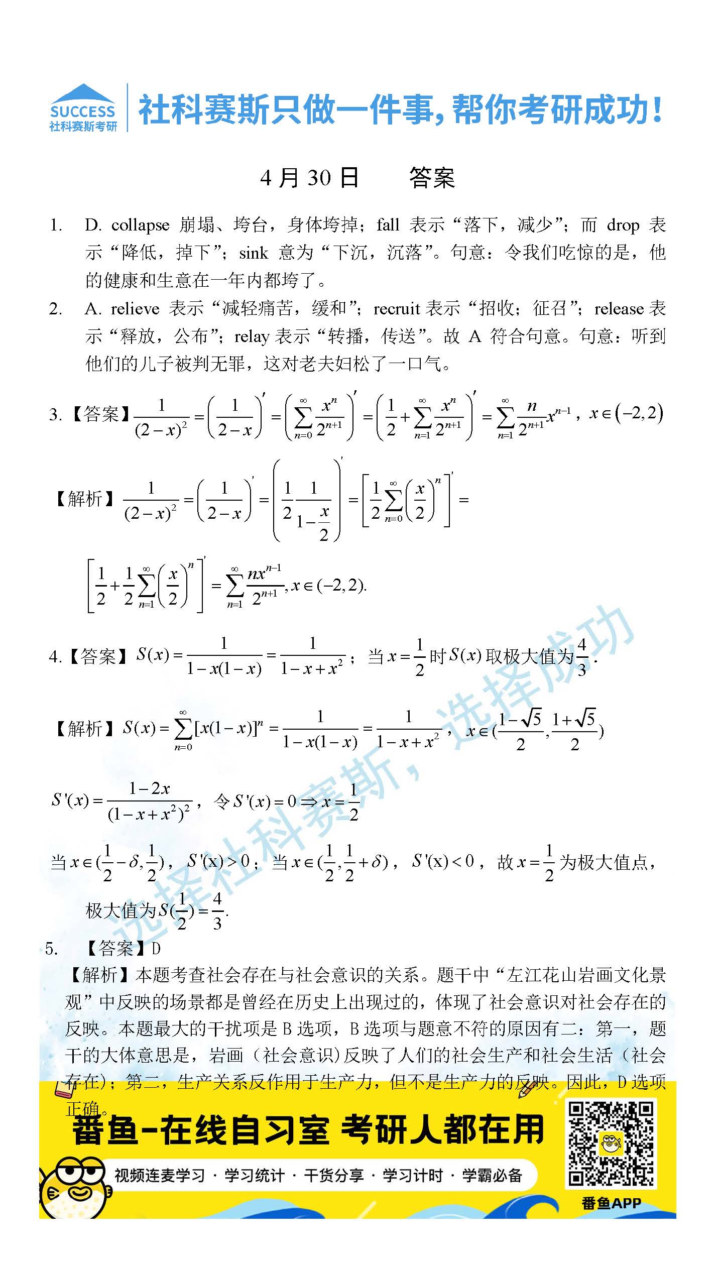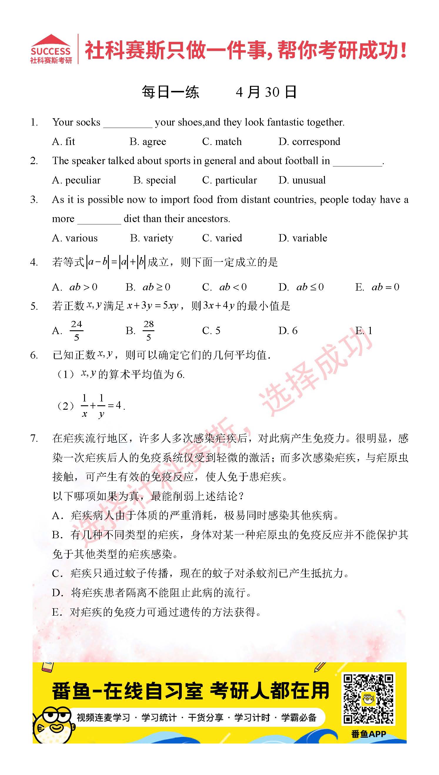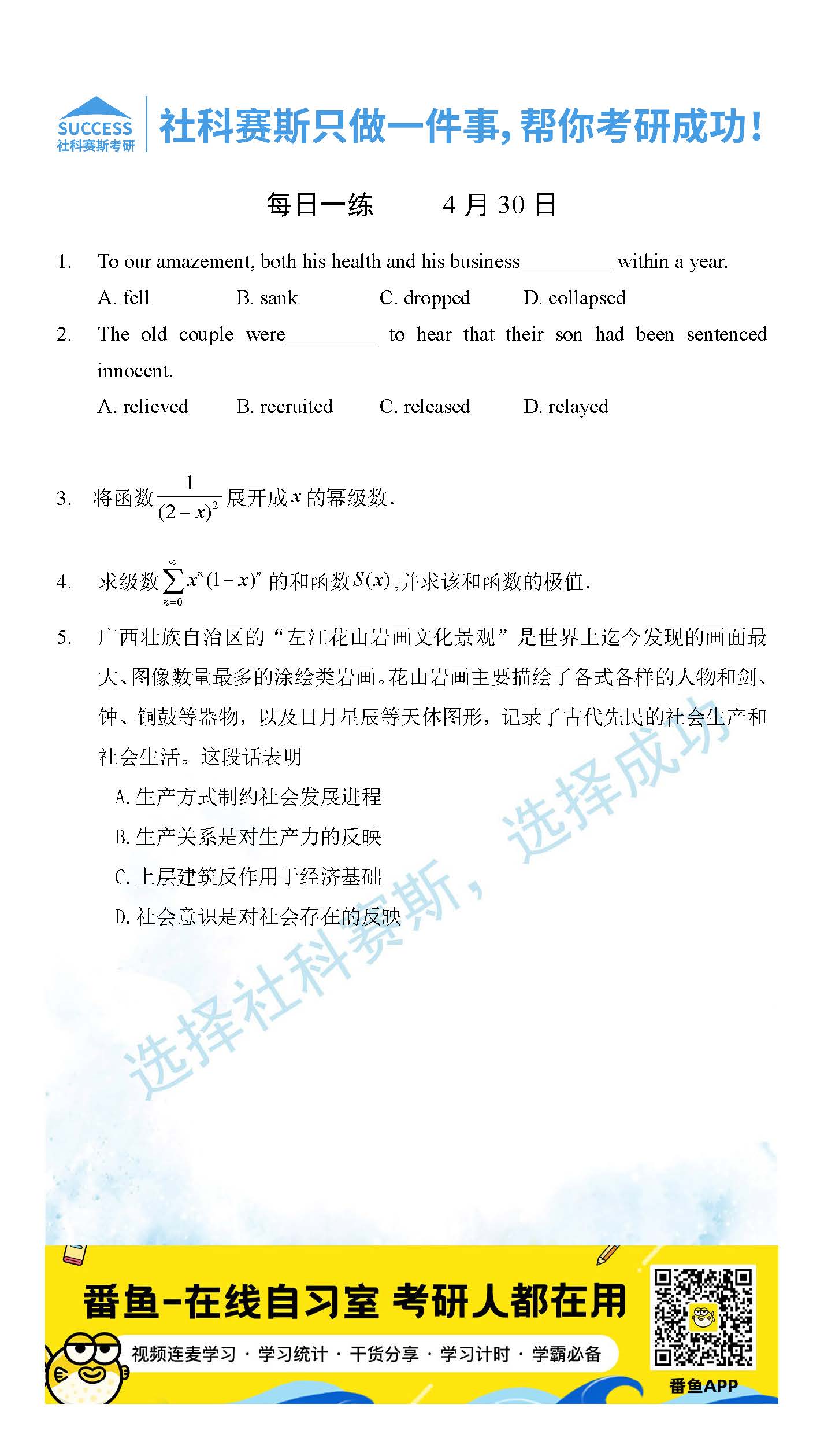 考研是一場持久戰(zhàn),保持良好的學(xué)習(xí)習(xí)慣,是能確保復(fù)習(xí)高效的關(guān)鍵。今天社科賽斯考研網(wǎng)小編整理了“2022考研每日一練:4月30管理類聯(lián)考每日一練及答案”的內(nèi)容,希望能對廣大考生有所幫助。