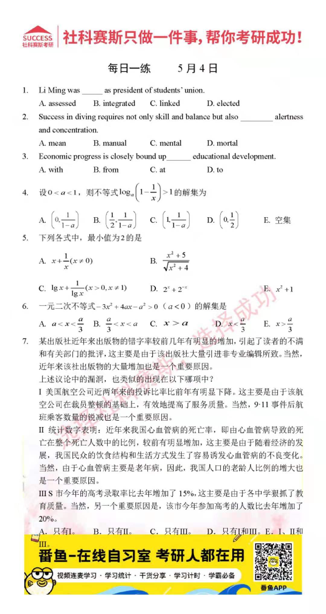 考研是一場持久戰(zhàn),保持良好的學(xué)習(xí)習(xí)慣,是能確保復(fù)習(xí)高效的關(guān)鍵。今天社科賽斯考研網(wǎng)小編整理了“2022考研每日一練:5月4管理類聯(lián)考每日一練及答案”的內(nèi)容,希望能對廣大考生有所幫助。