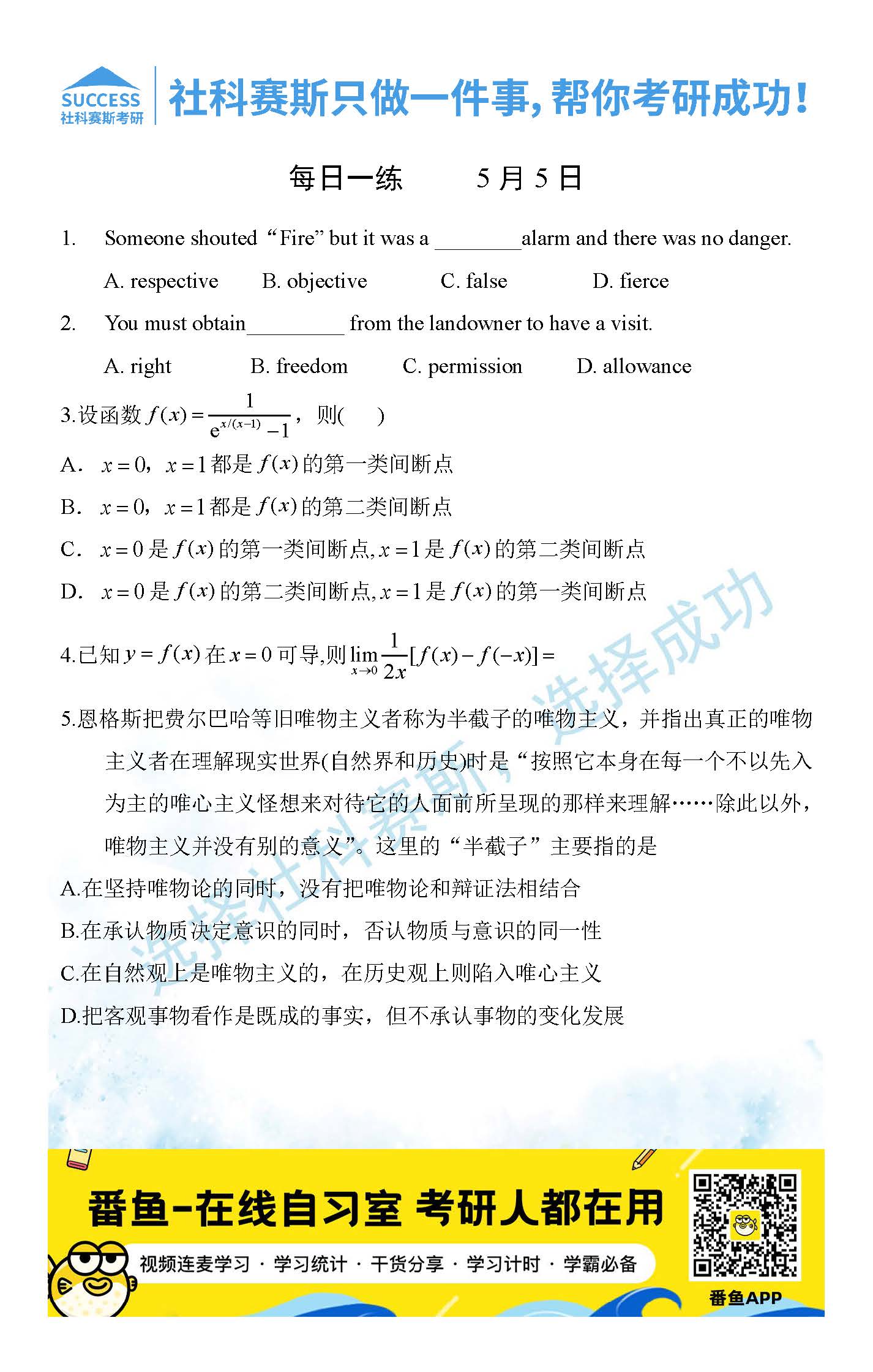 考研是一場持久戰(zhàn),保持良好的學(xué)習(xí)習(xí)慣,是能確保復(fù)習(xí)高效的關(guān)鍵。今天社科賽斯考研網(wǎng)小編整理了“2022考研每日一練:5月5管理類聯(lián)考每日一練及答案”的內(nèi)容,希望能對廣大考生有所幫助。