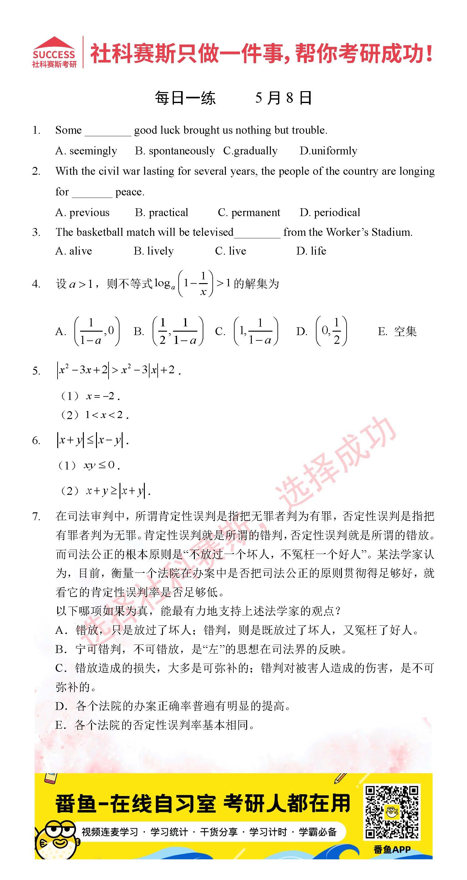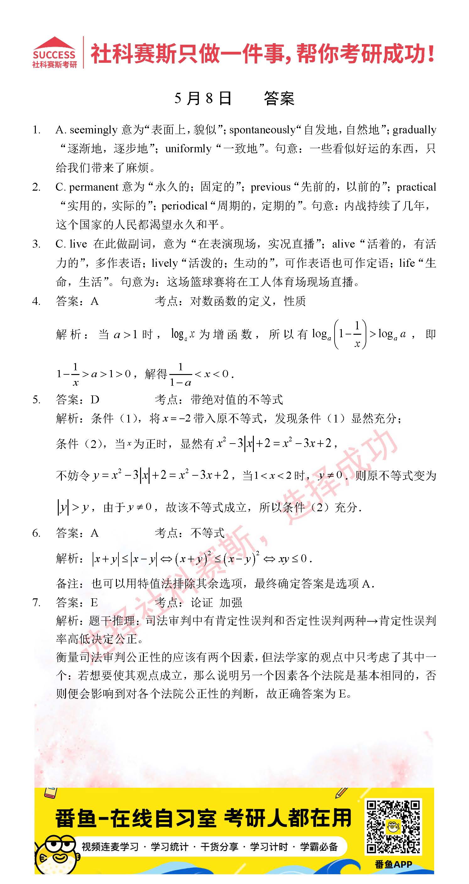 以上就是社科賽斯考研網(wǎng)小編為大家整理2022考研每日一練:5月8日管理類聯(lián)考每日一練及答案的全部內(nèi)容,希望各位考生堅持利用起來,更多每日一練內(nèi)容請持續(xù)關(guān)注社科賽斯考研網(wǎng)。