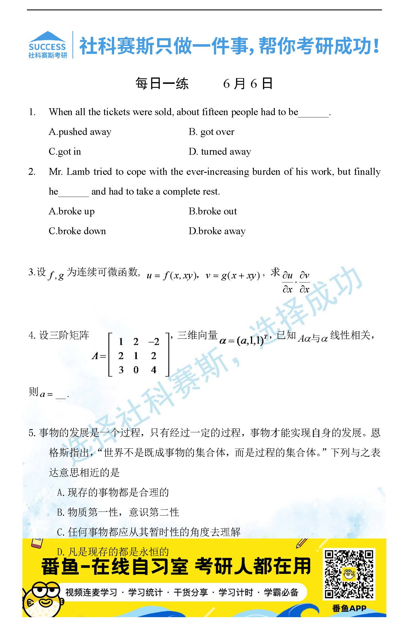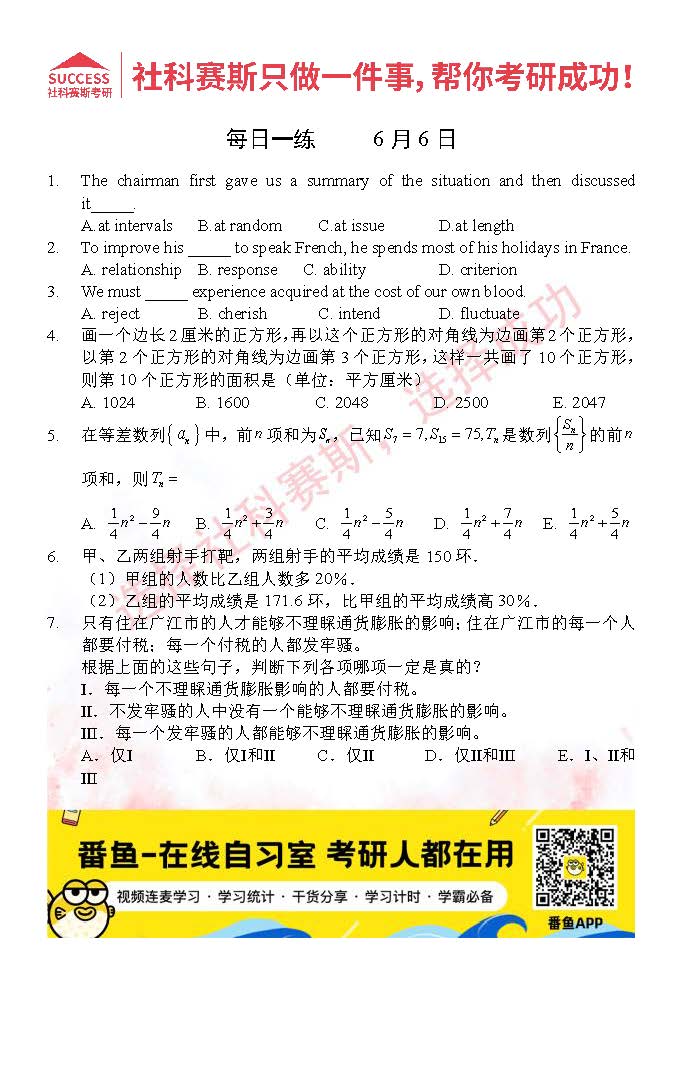 以上就是社科賽斯考研網(wǎng)小編為大家整理2022考研每日一練:6月6日管理類聯(lián)考每日一練及答案的全部內(nèi)容,希望各位考生堅持利用起來,更多每日一練內(nèi)容請持續(xù)關(guān)注社科賽斯考研網(wǎng)。
