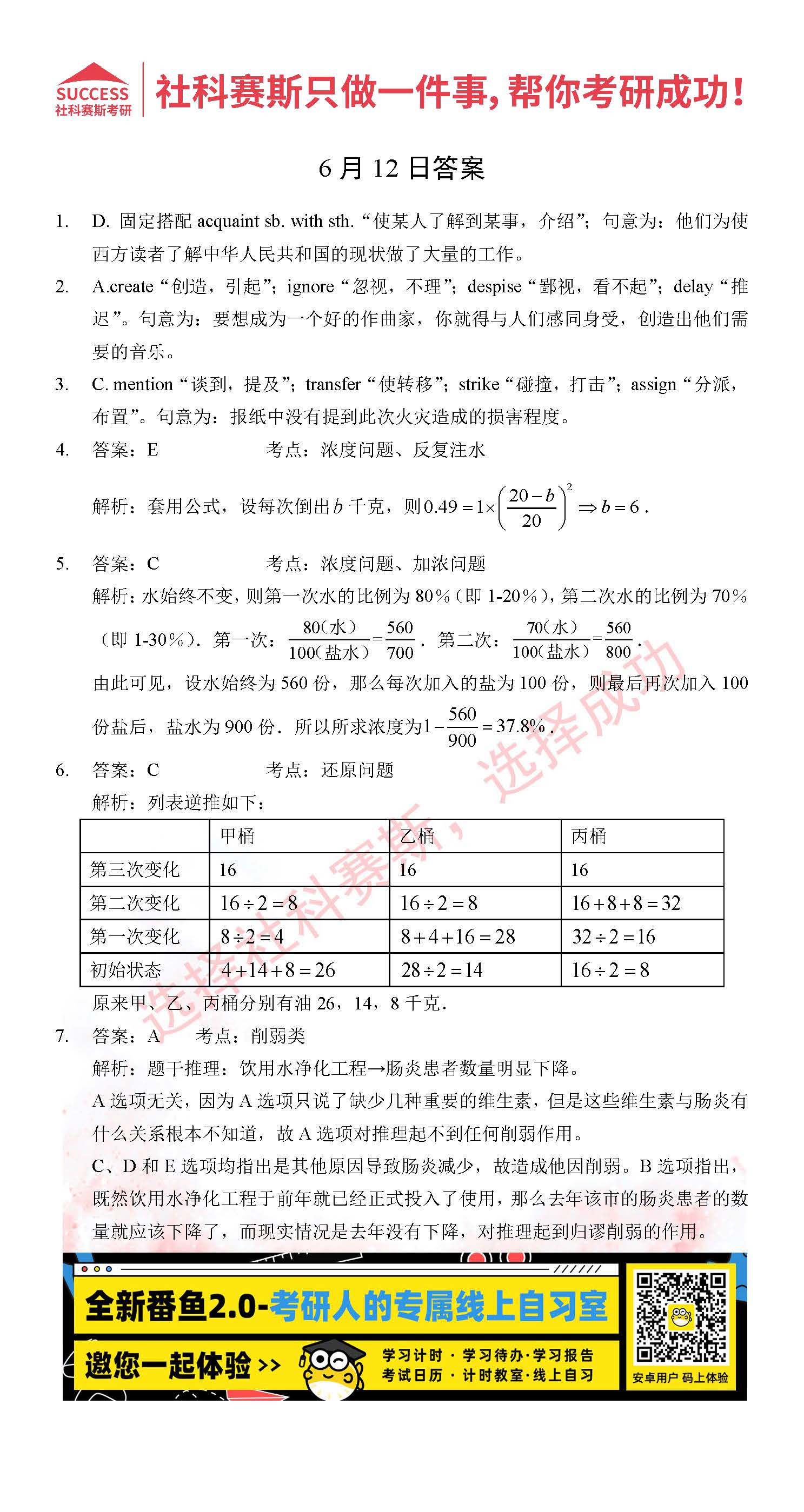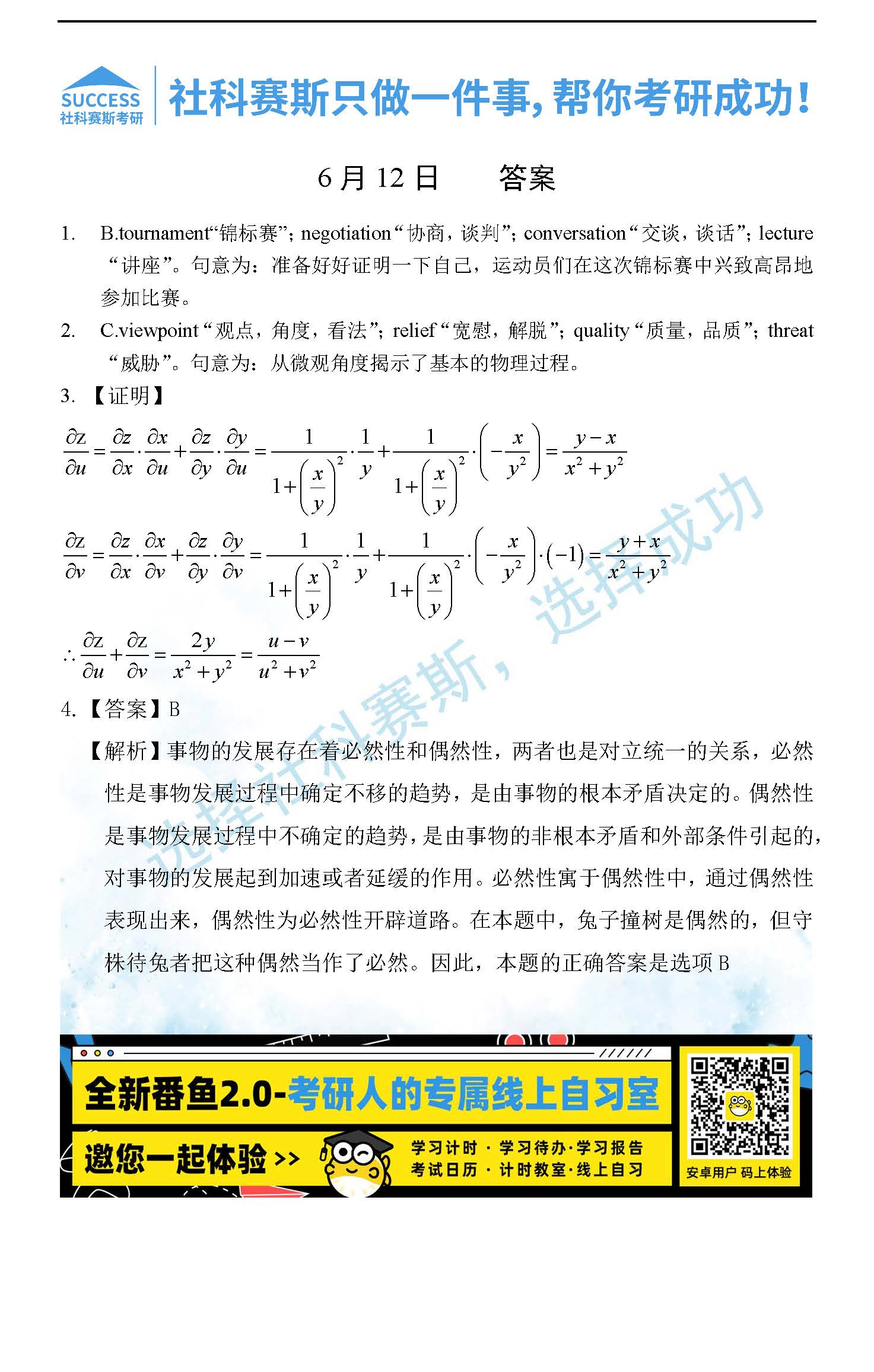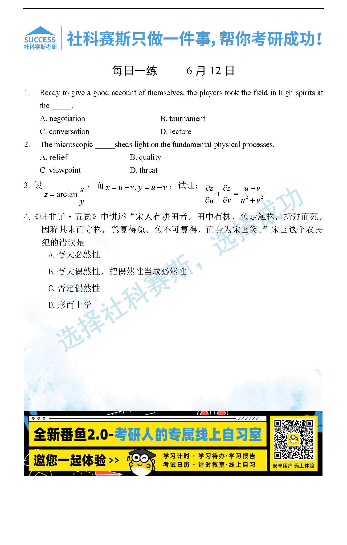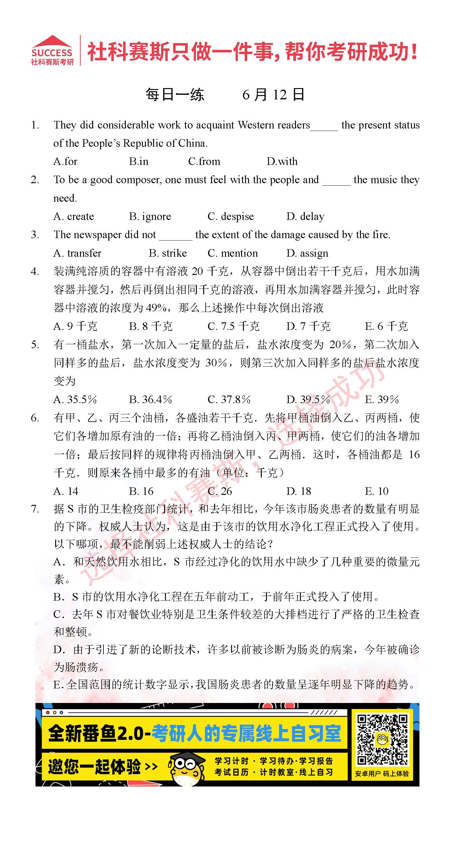 考研是一場(chǎng)持久戰(zhàn),保持良好的學(xué)習(xí)習(xí)慣,是能確保復(fù)習(xí)高效的關(guān)鍵。今天社科賽斯考研網(wǎng)小編整理了“2022考研每日一練:6月12日管理類(lèi)聯(lián)考每日一練及答案”的內(nèi)容,希望能對(duì)廣大考生有所幫助。