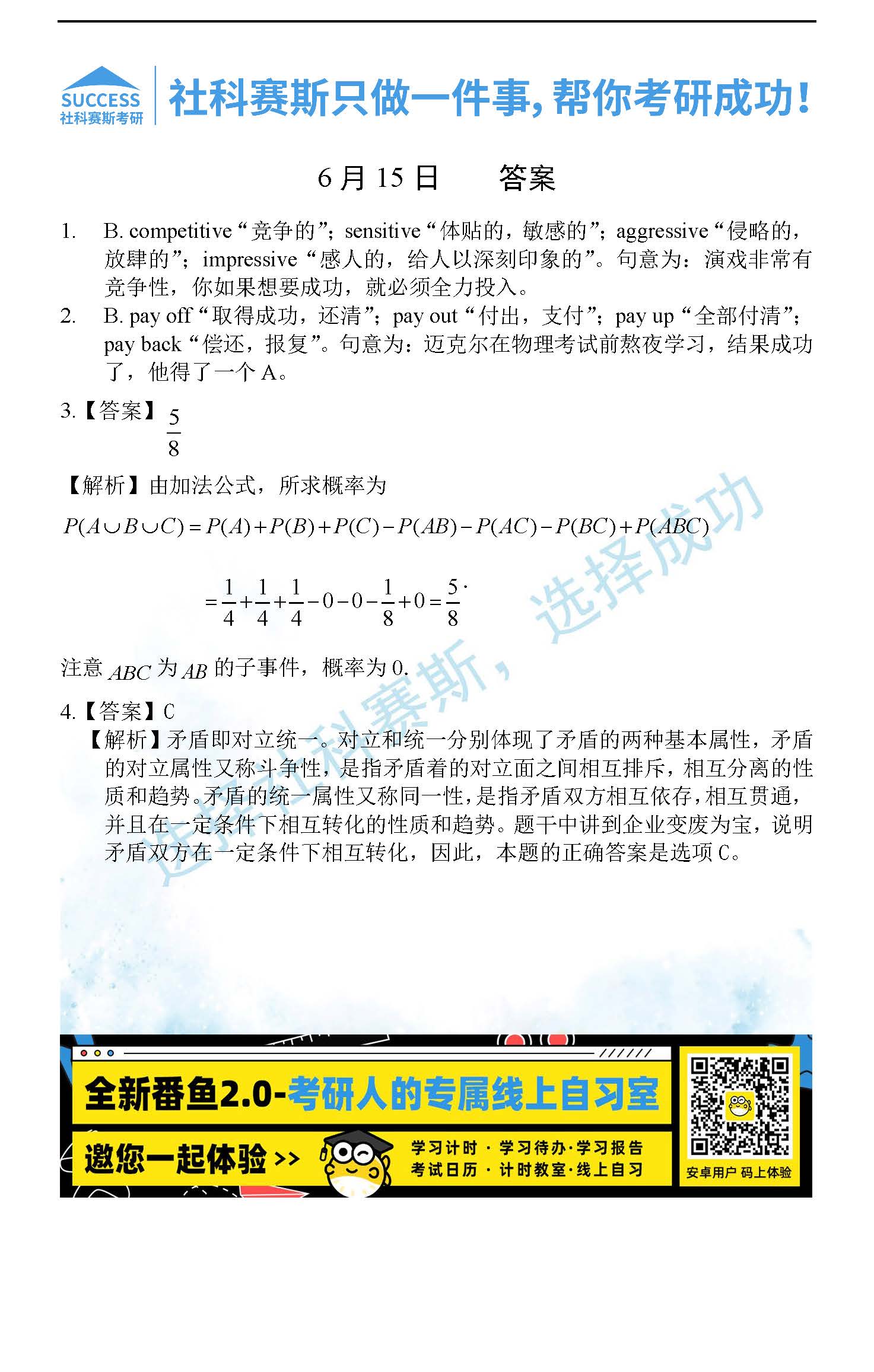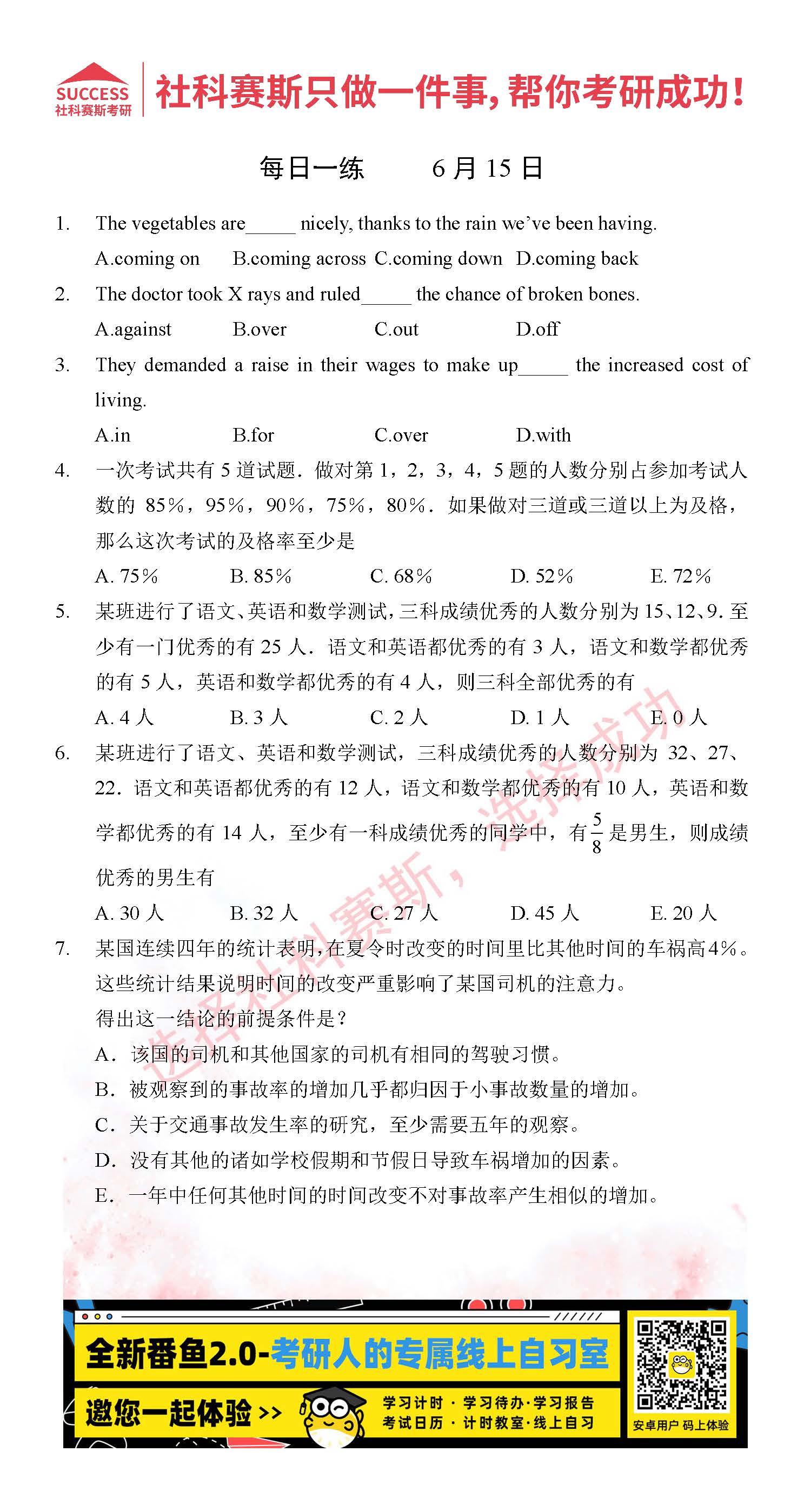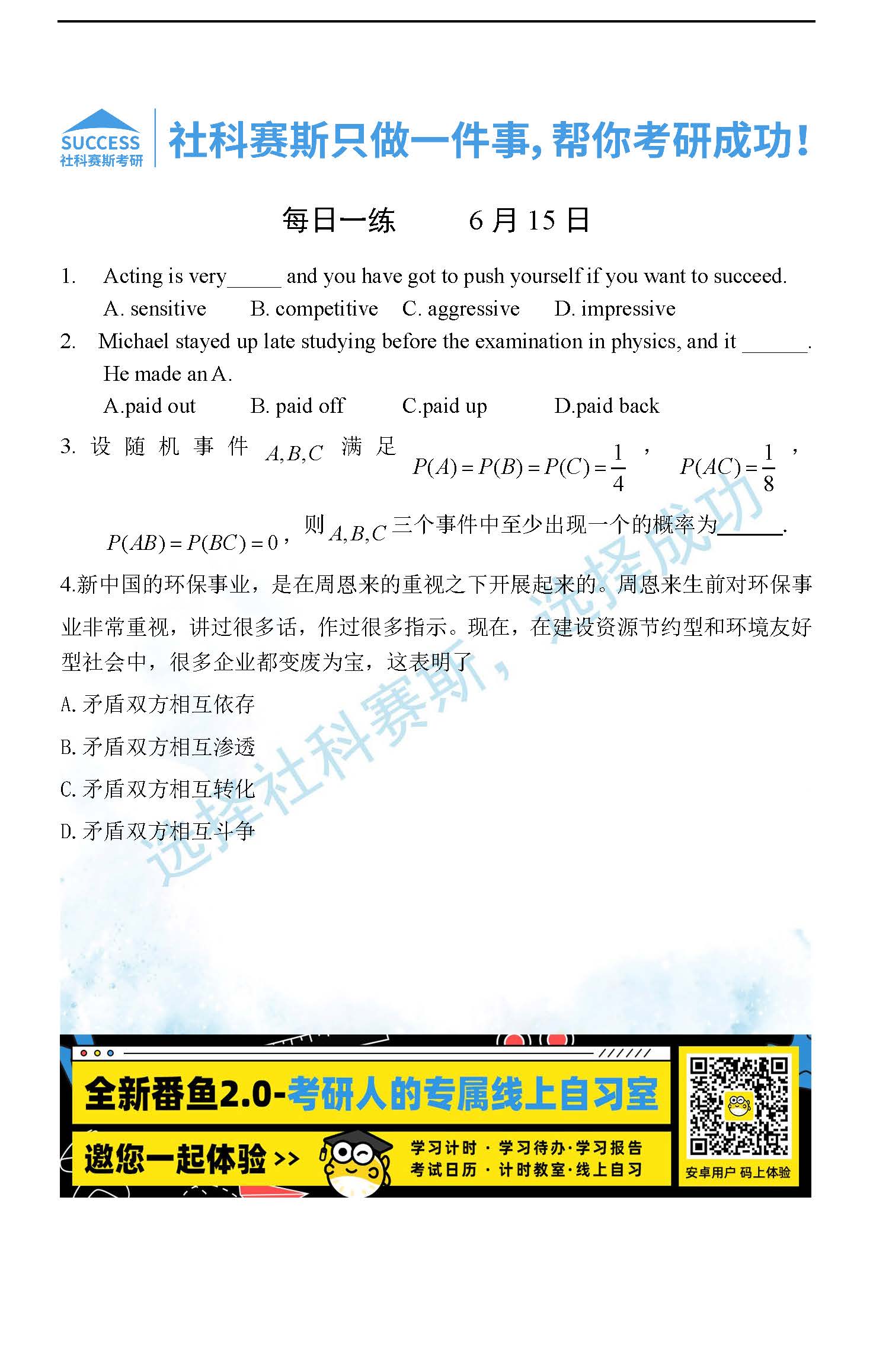 考研是一場(chǎng)持久戰(zhàn),保持良好的學(xué)習(xí)習(xí)慣,是能確保復(fù)習(xí)高效的關(guān)鍵。今天社科賽斯考研網(wǎng)小編整理了“2022考研每日一練:6月15日管理類(lèi)聯(lián)考每日一練及答案”的內(nèi)容,希望能對(duì)廣大考生有所幫助。