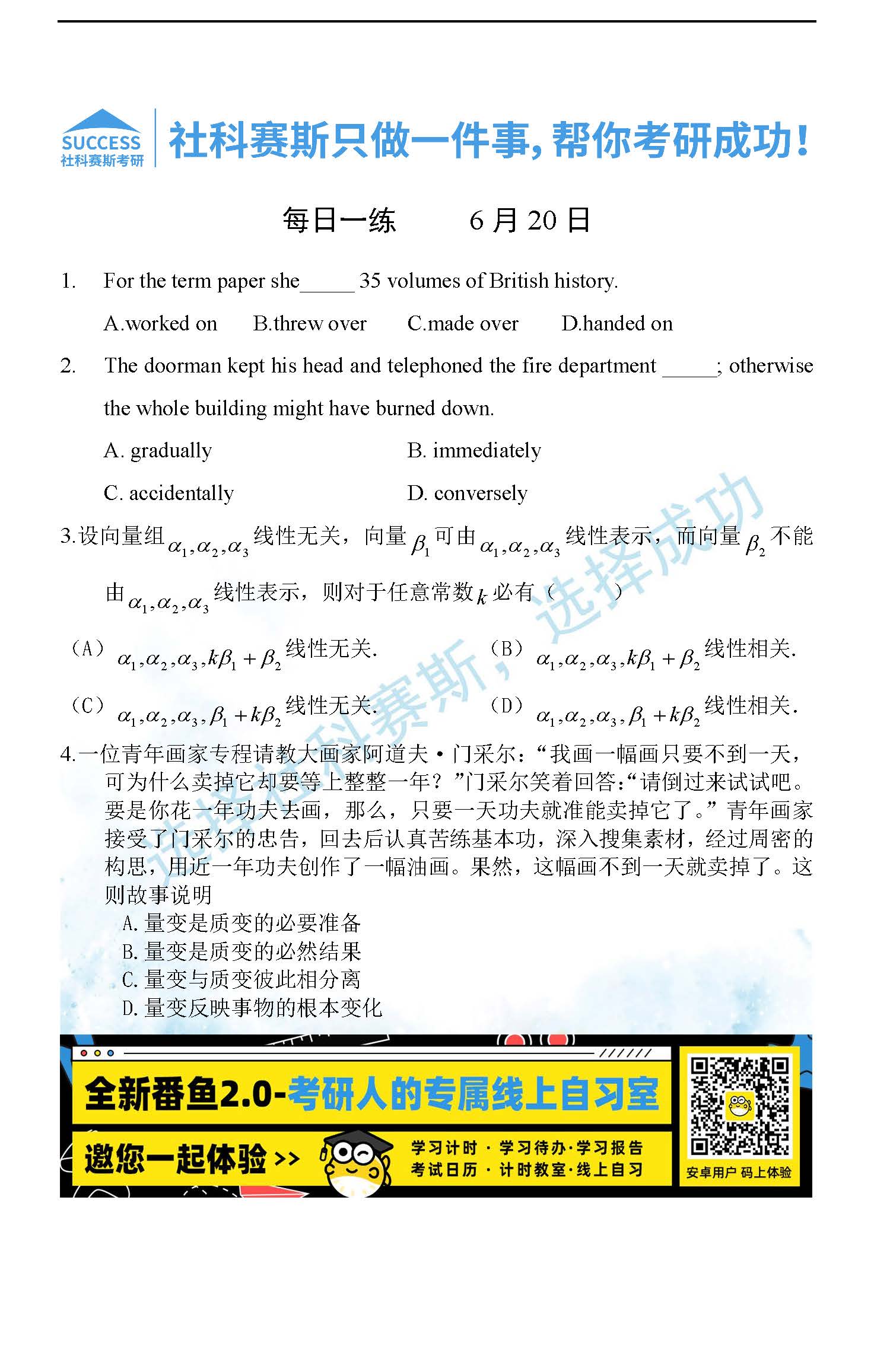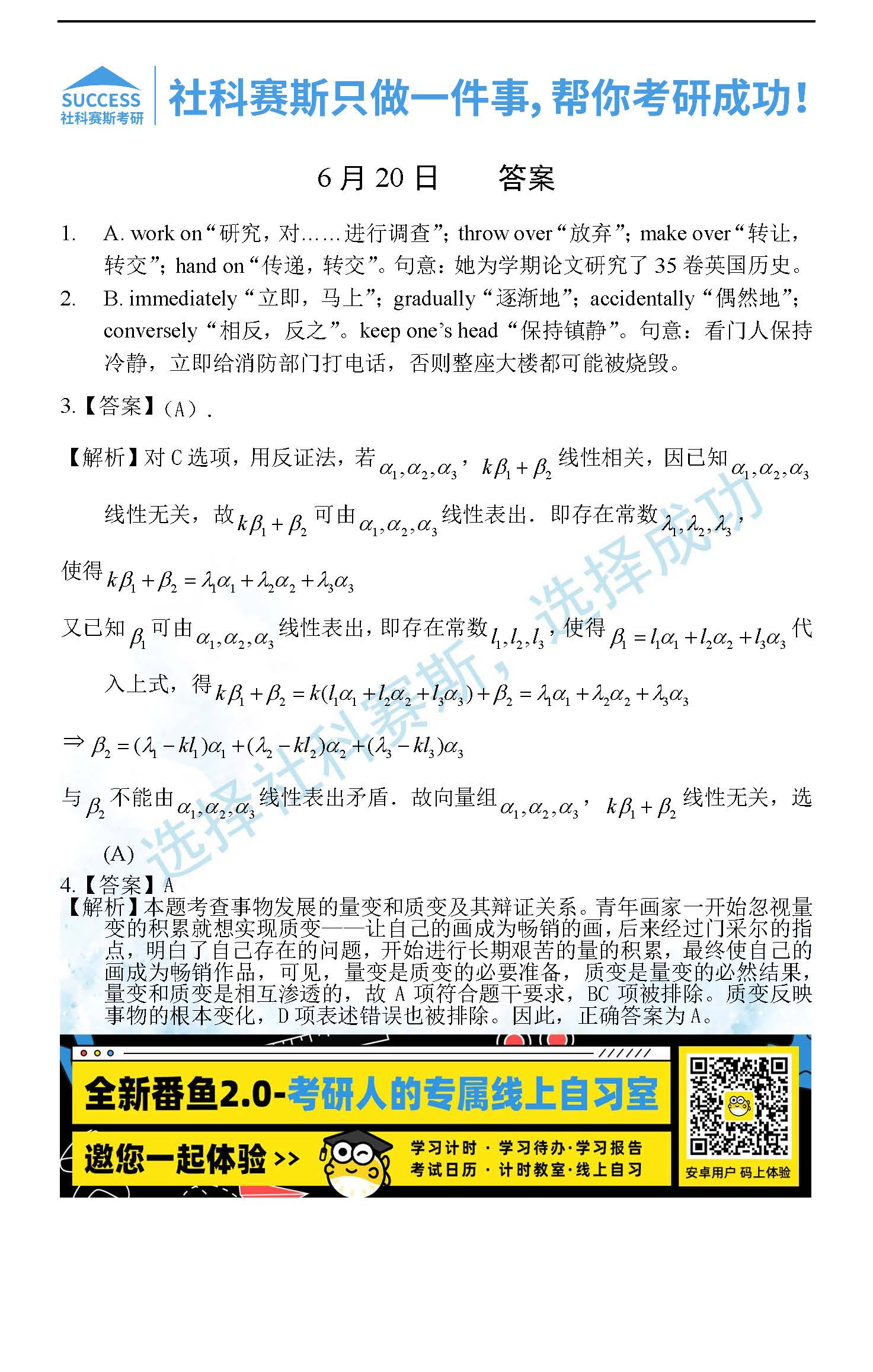 考研是一場持久戰(zhàn),保持良好的學(xué)習(xí)習(xí)慣,是能確保復(fù)習(xí)高效的關(guān)鍵。今天社科賽斯考研網(wǎng)小編整理了“2022考研每日一練:6月20日管理類聯(lián)考每日一練及答案”的內(nèi)容,希望能對廣大考生有所幫助。