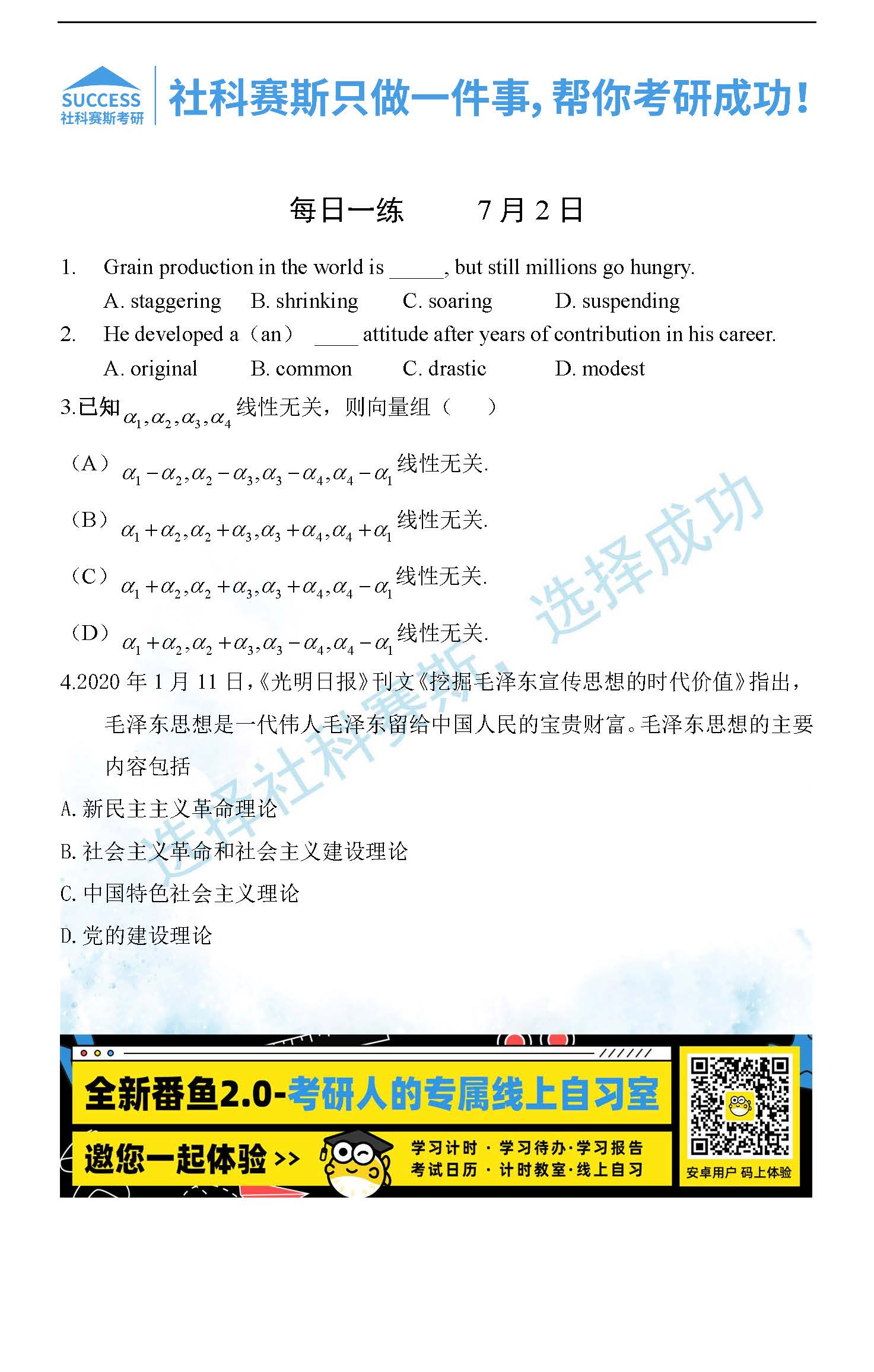 考研是一場持久戰(zhàn),保持良好的學習習慣,是能確保復習高效的關鍵。今天社科賽斯考研網(wǎng)小編整理了“2022考研每日一練:7月2日管理類聯(lián)考每日一練及答案”的內(nèi)容,希望能對廣大考生有所幫助。