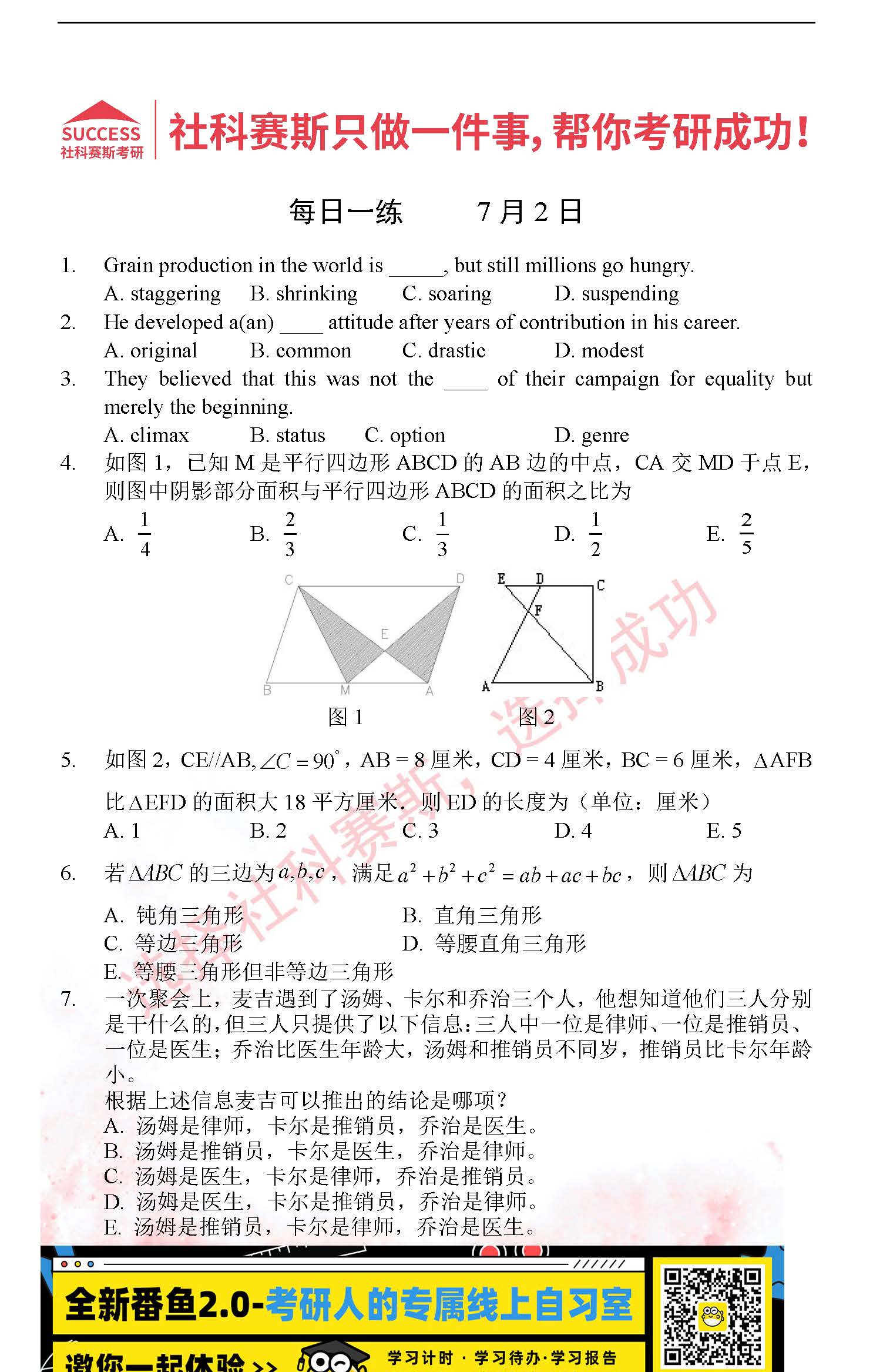 2022考研每日一練:7月2日管理類聯(lián)考每日一練及答案