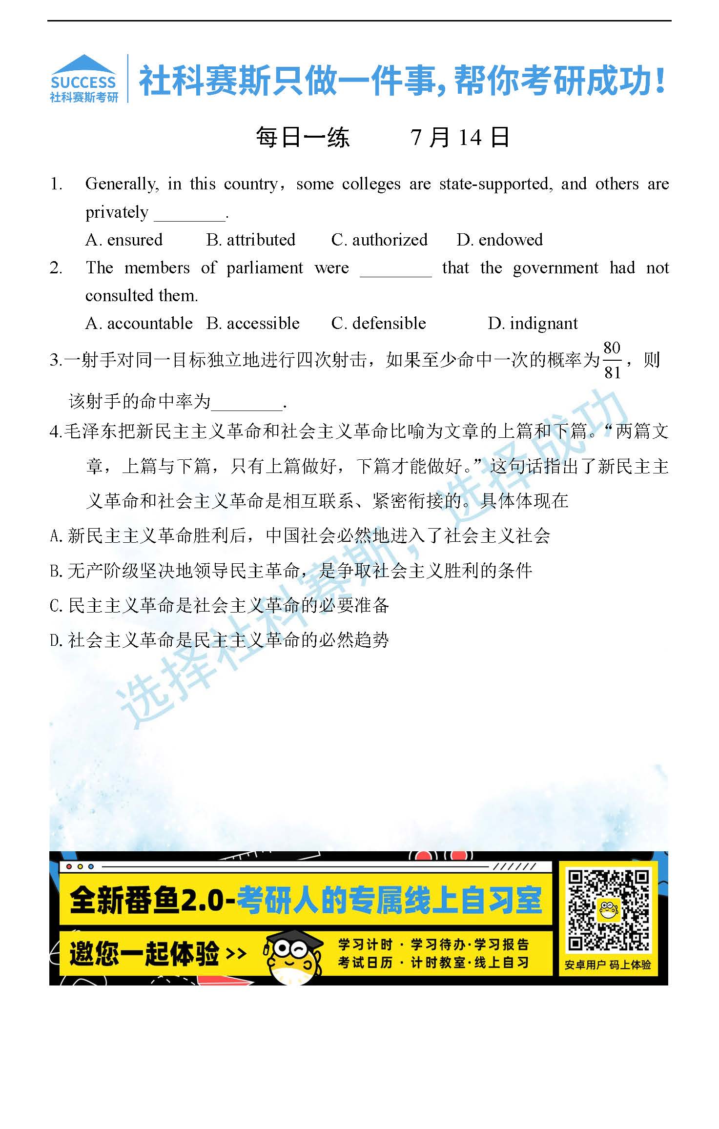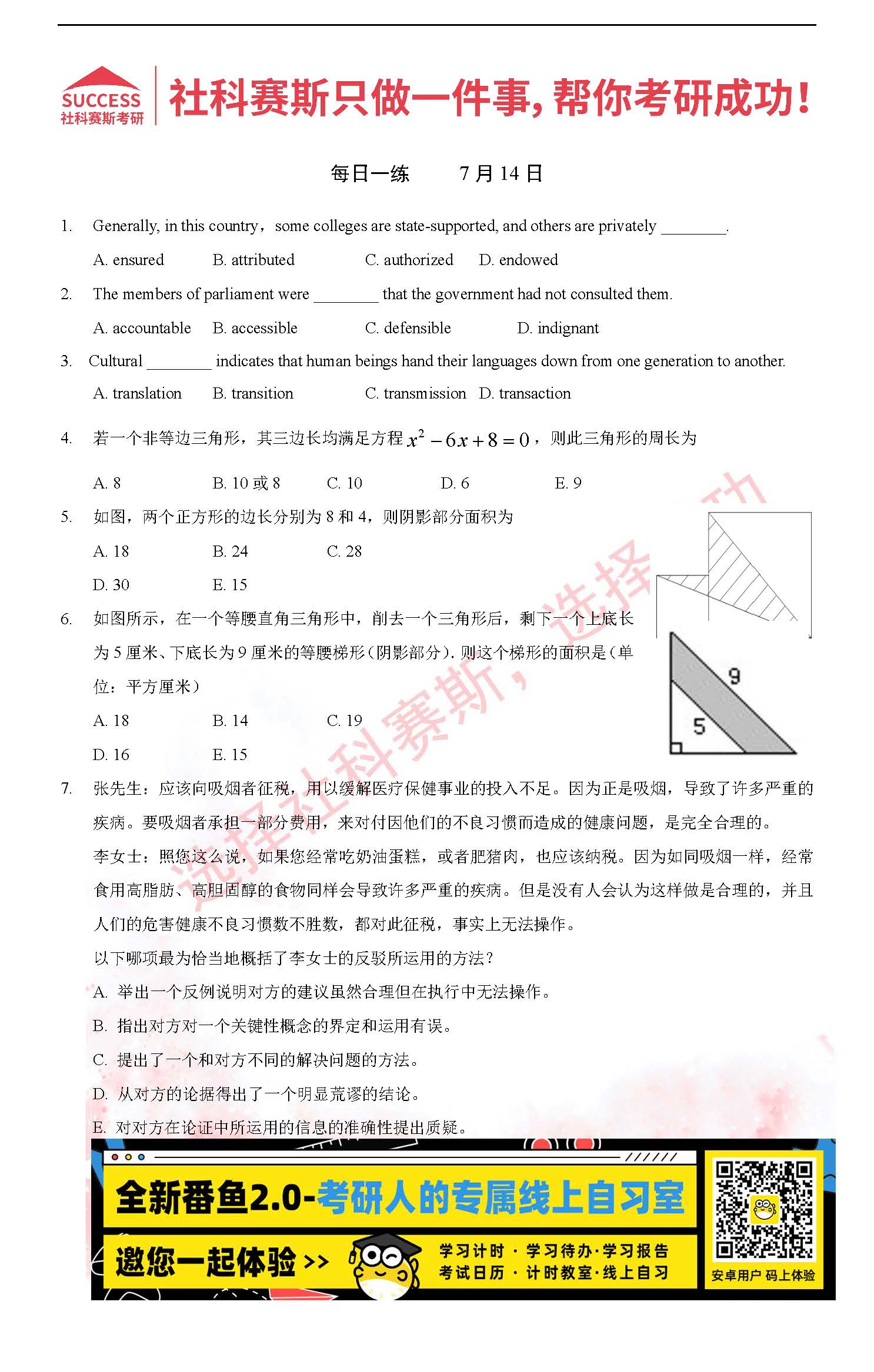 2022考研每日一練:7月14日管理類聯(lián)考每日一練及答案