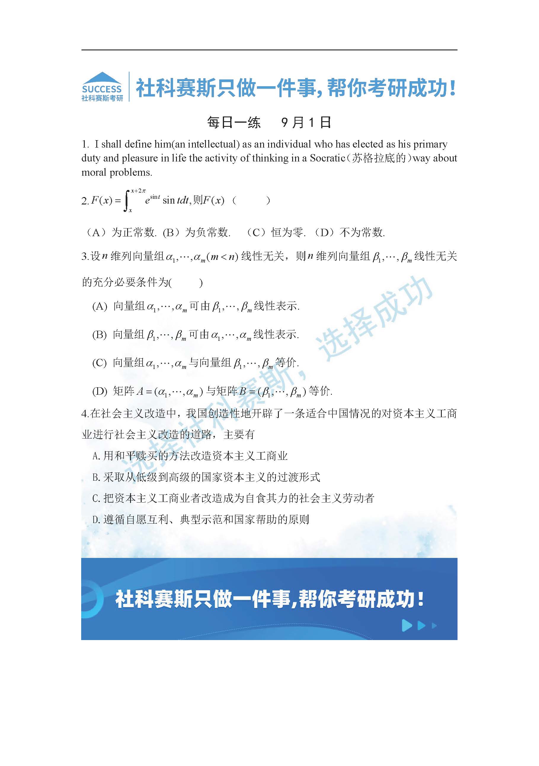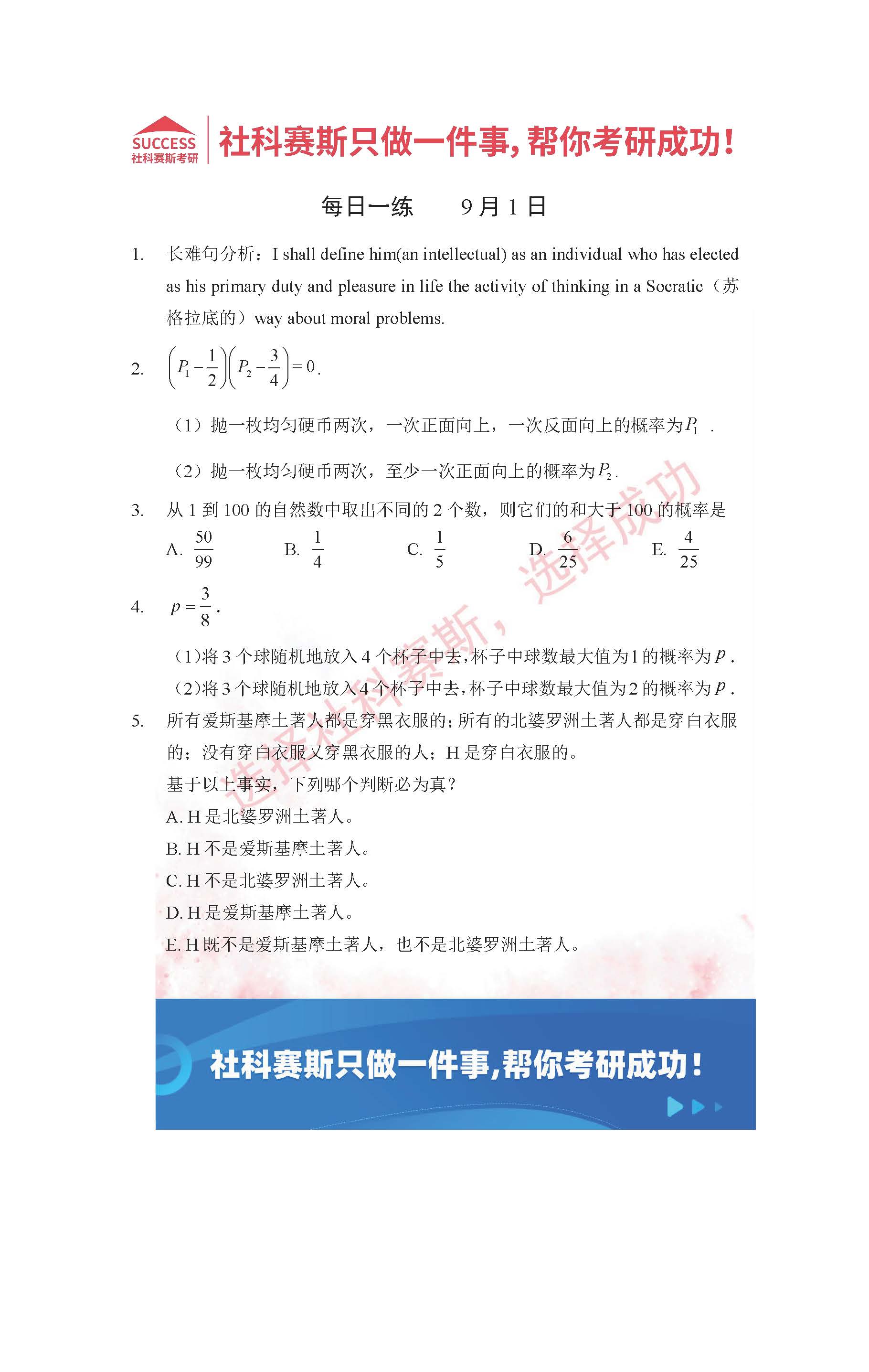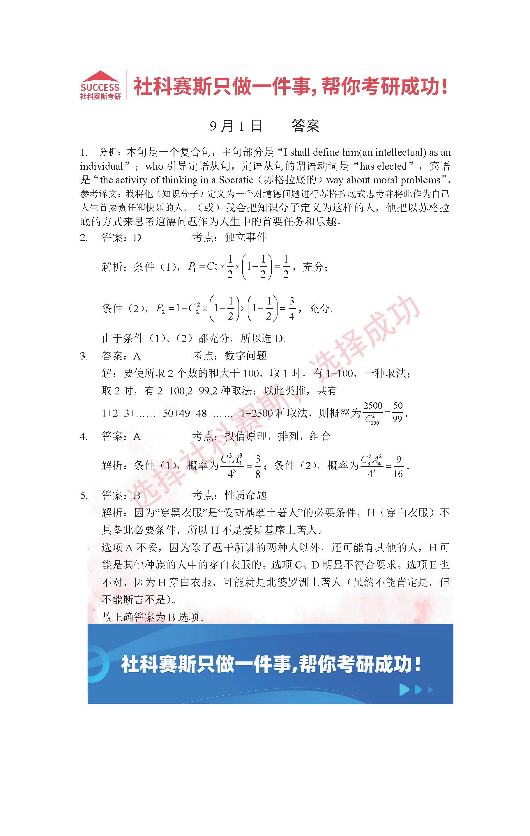 以上就是社科賽斯考研網(wǎng)小編為大家整理2022考研每日一練:9月1日管理類聯(lián)考每日一練及答案的全部?jī)?nèi)容,希望各位考生堅(jiān)持利用起來(lái),更多每日一練內(nèi)容請(qǐng)持續(xù)關(guān)注社科賽斯考研網(wǎng)。