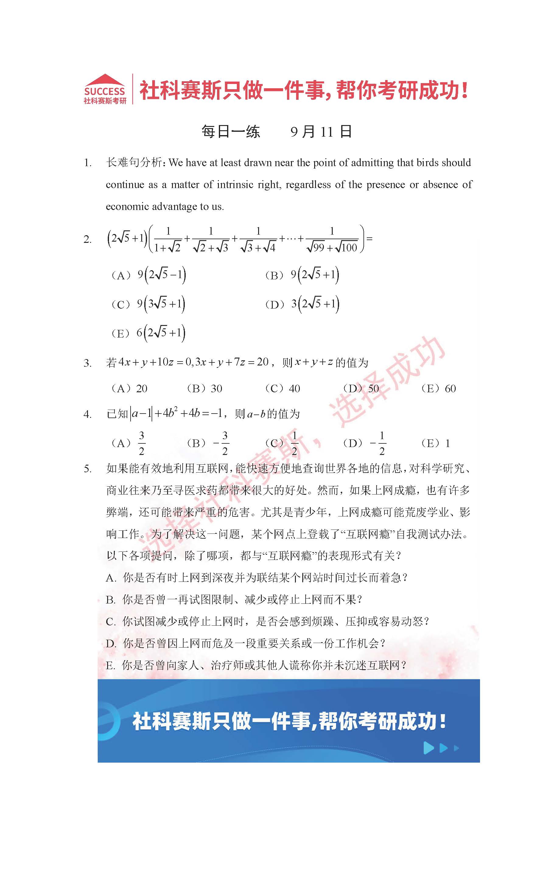 以上就是社科賽斯考研網(wǎng)小編為大家整理2022考研每日一練:9月11日管理類聯(lián)考每日一練及答案的全部內(nèi)容,希望各位考生堅持利用起來,更多每日一練內(nèi)容請持續(xù)關(guān)注社科賽斯考研網(wǎng)。