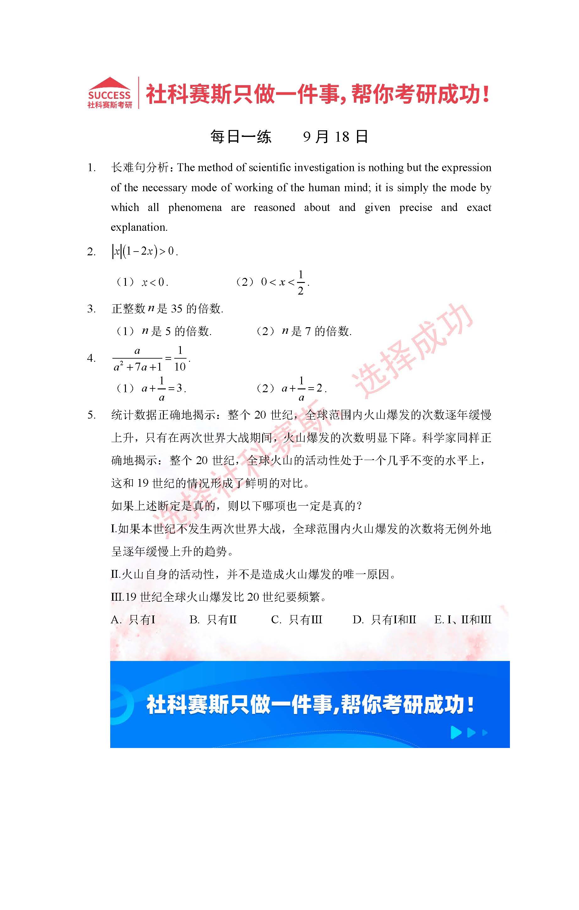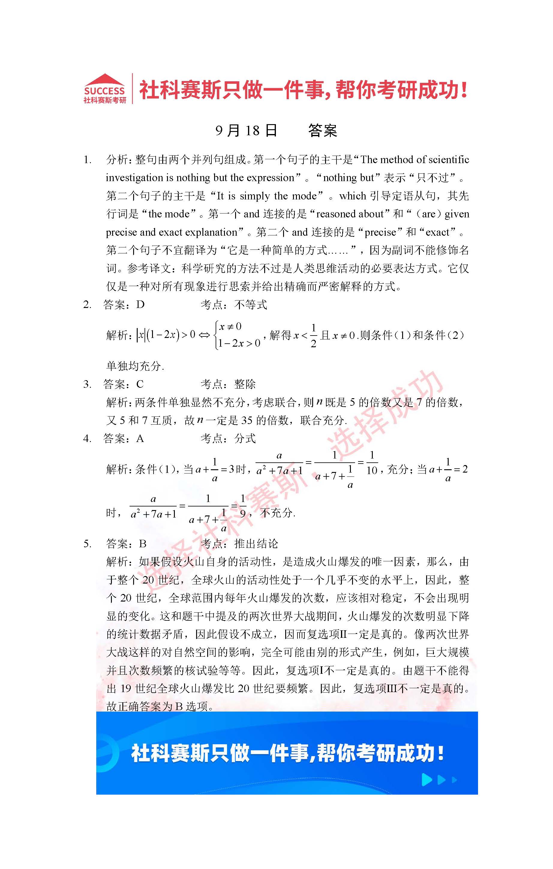 以上就是社科賽斯考研網(wǎng)小編為大家整理2022考研每日一練:9月18日管理類聯(lián)考每日一練及答案的全部內(nèi)容,希望各位考生堅持利用起來,更多每日一練內(nèi)容請持續(xù)關(guān)注社科賽斯考研網(wǎng)。