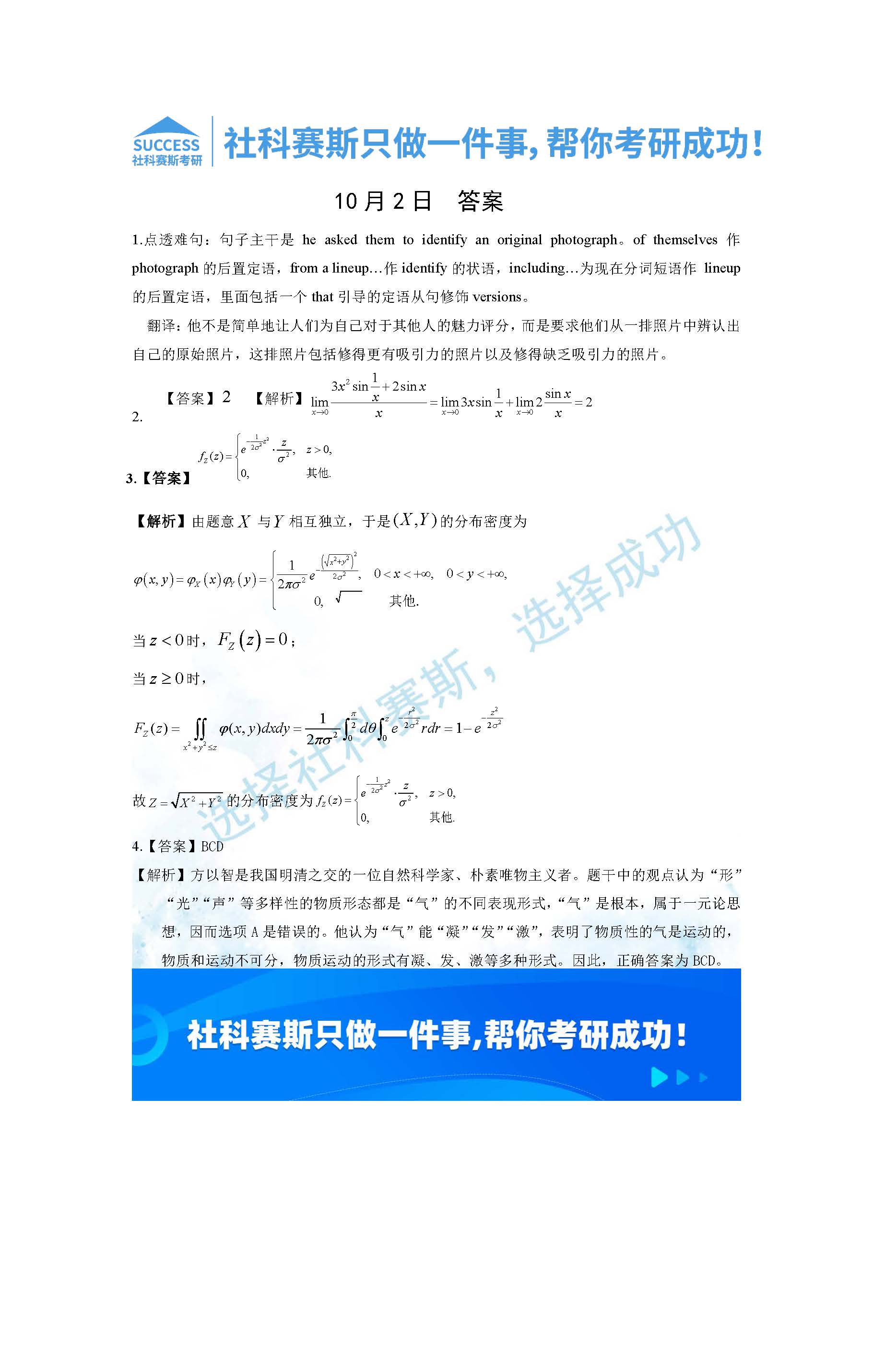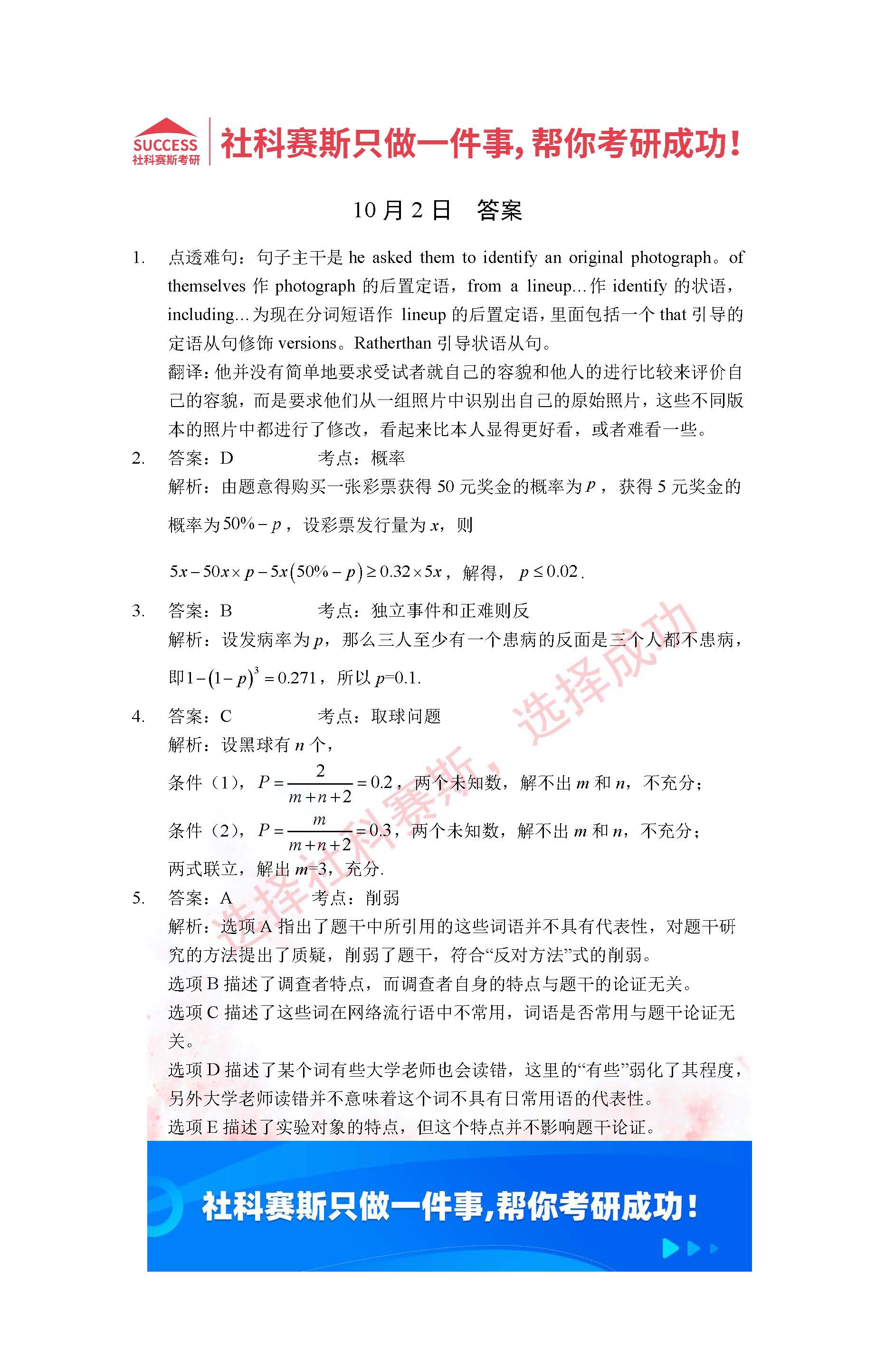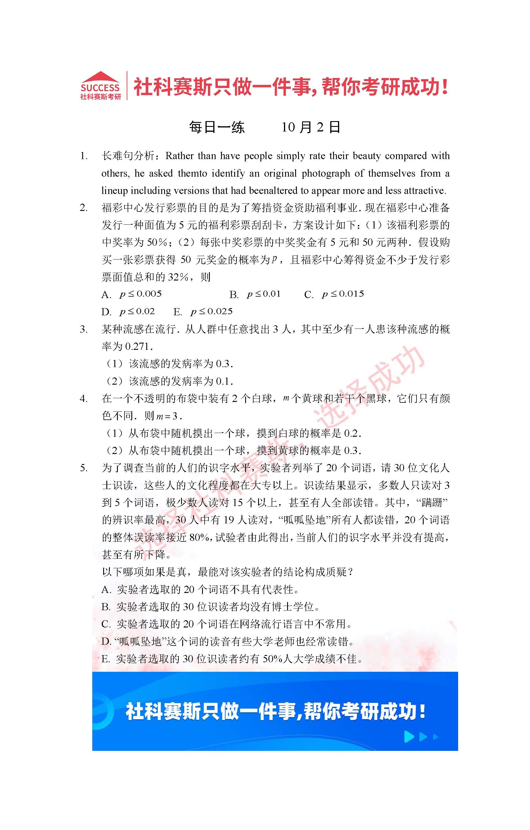 以上就是社科賽斯考研網(wǎng)小編為大家整理2022考研每日一練:10月2日管理類聯(lián)考每日一練及答案的全部?jī)?nèi)容,希望各位考生堅(jiān)持利用起來,更多每日一練內(nèi)容請(qǐng)持續(xù)關(guān)注社科賽斯考研網(wǎng)。