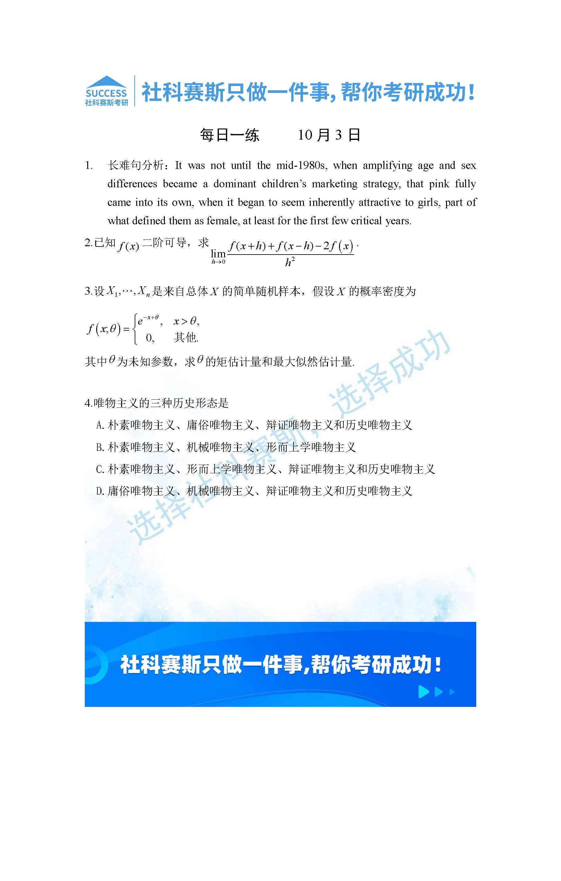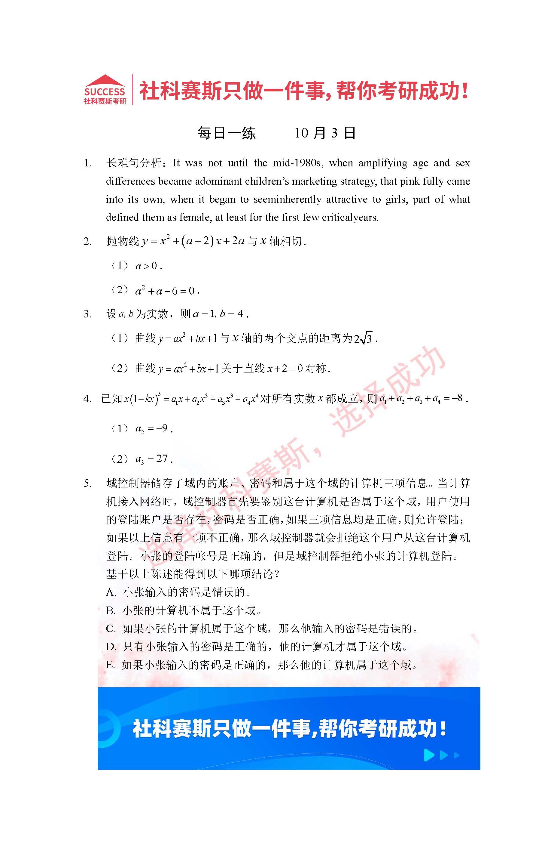 以上就是社科賽斯考研網(wǎng)小編為大家整理2022考研每日一練:10月3日管理類聯(lián)考每日一練及答案的全部內(nèi)容,希望各位考生堅持利用起來,更多每日一練內(nèi)容請持續(xù)關(guān)注社科賽斯考研網(wǎng)。