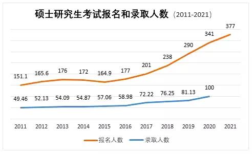 從近7年的數(shù)據(jù)來看,研究生報考人數(shù)從2015年的164.9萬,激增到2021年的377萬,年復(fù)合增長率達(dá)14.77%!其中,增長最快的是2019級和2020級,兩年的增長率均超18%,考研競爭已經(jīng)呈現(xiàn)白熱化、白刃化。
