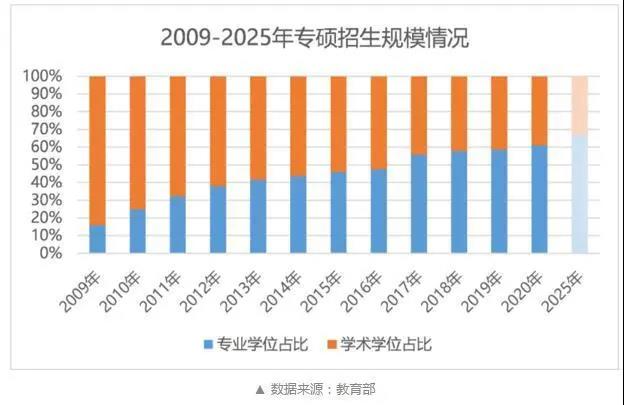 目前,國家已經(jīng)設(shè)立了專碩教育的發(fā)展目標(biāo):到2025年,以國家重大戰(zhàn)略、關(guān)鍵領(lǐng)域和社會重大需求為重點,增設(shè)一批碩士、博士專業(yè)學(xué)位類別,將碩士專業(yè)學(xué)位研究生招生規(guī)模擴(kuò)大到碩士研究生招生總規(guī)模的三分之二左右,大幅增加博士專業(yè)學(xué)位研究生招生數(shù)量,進(jìn)一步創(chuàng)新專業(yè)學(xué)位研究生培養(yǎng)模式,產(chǎn)教融合培養(yǎng)機(jī)制更加健全,專業(yè)學(xué)位與職業(yè)資格銜接更加緊密,發(fā)展機(jī)制和環(huán)境更加優(yōu)化,教育質(zhì)量水平顯著提升,建成靈活規(guī)范、產(chǎn)教融合、優(yōu)質(zhì)高效、符合規(guī)律的專業(yè)學(xué)位研究生教育體系。