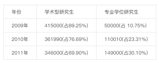2011年,全國招收碩士49.5萬人、比2010年增加2.3萬人,增幅4.9%。在招收的碩士研究生中,學(xué)術(shù)型34.6萬人,比2010年減少1.59萬,減幅4.42%;專業(yè)學(xué)位14.9萬人,比2010年增加3.89萬人,增幅35.44%。