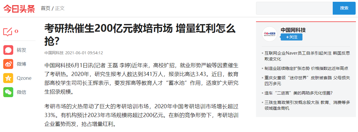 考研市場的火熱帶動了巨大的考研培訓(xùn)市場,2020年中國考研培訓(xùn)市場增長超過33%。有機(jī)構(gòu)預(yù)計2023年市場規(guī)模將超過200億元。在新的競爭形勢下,考研培訓(xùn)企業(yè)蓄勢而發(fā),搶占增量紅利。