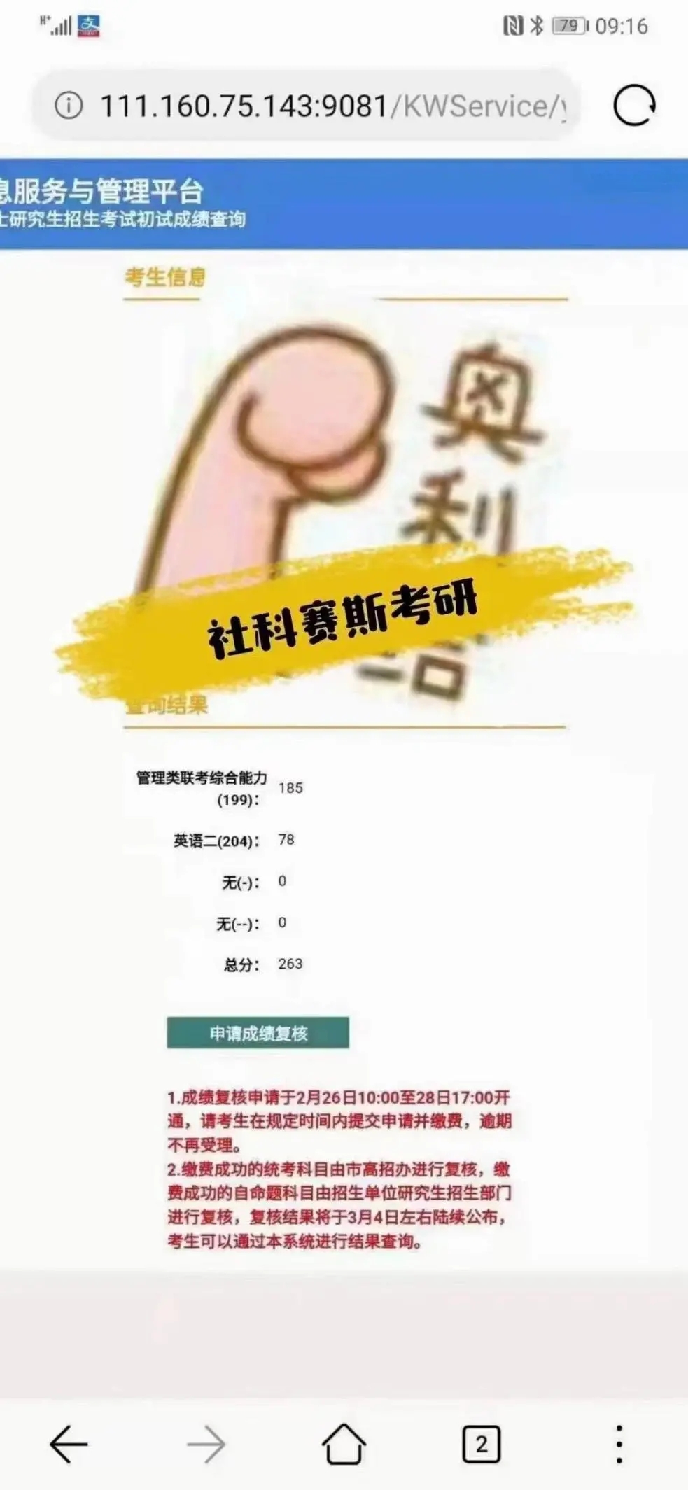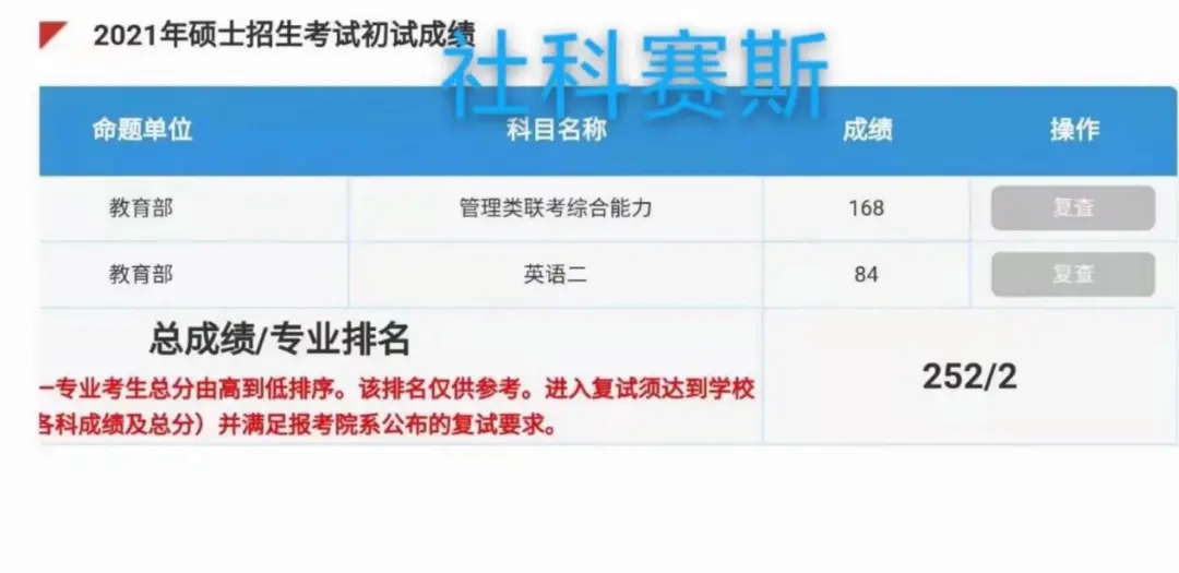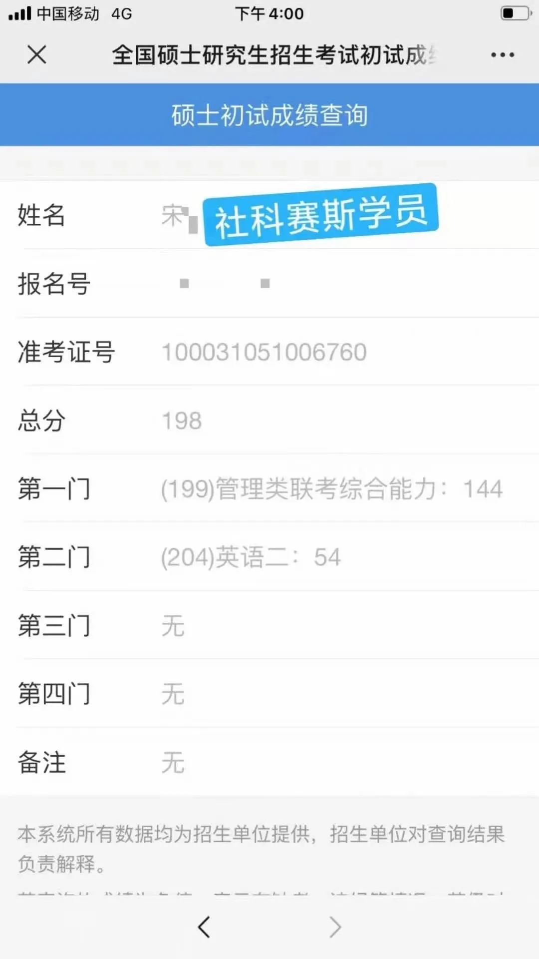 成績查詢結(jié)果,從圖可見,他們的成績很優(yōu)秀,每一個分數(shù)背后,都有社科賽斯人的努力與付出,但更多的,是學員對考研的堅持,對自己改變命運信念的堅定!