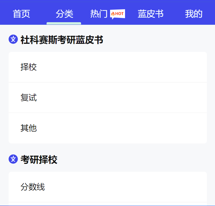 社科賽斯考驗(yàn)藍(lán)皮書(shū)、考研擇校、考研備考、考研真題、考研復(fù)試、考研調(diào)劑、考研通識(shí)攻略大全、考證考公這八大類。