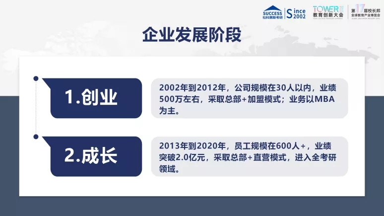 到目前為止,公司發(fā)展分為兩個階段:第一個是2002年-2012年,叫公司的創(chuàng)業(yè)期。創(chuàng)業(yè)期公司規(guī)模始終維持在30人以內(nèi),主要業(yè)務(wù)是:依托于北京,在全國開設(shè)加盟分公司。高峰時期達(dá)到50家,以MBA業(yè)務(wù)為主。